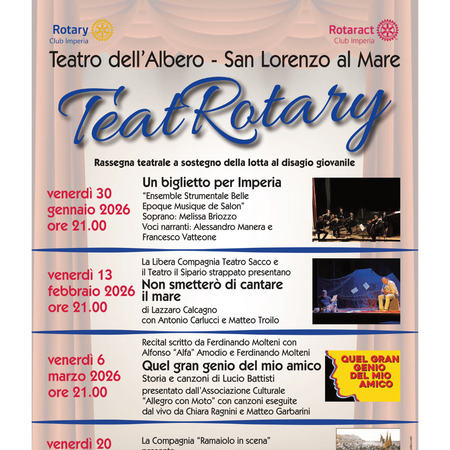 Il Rotary Imperia presenta TeatRotary 2026, una rassegna teatrale a sostegno della lotta al disagio giovanile, con spettacoli, musica e teatro al Teatro dell'Albero.