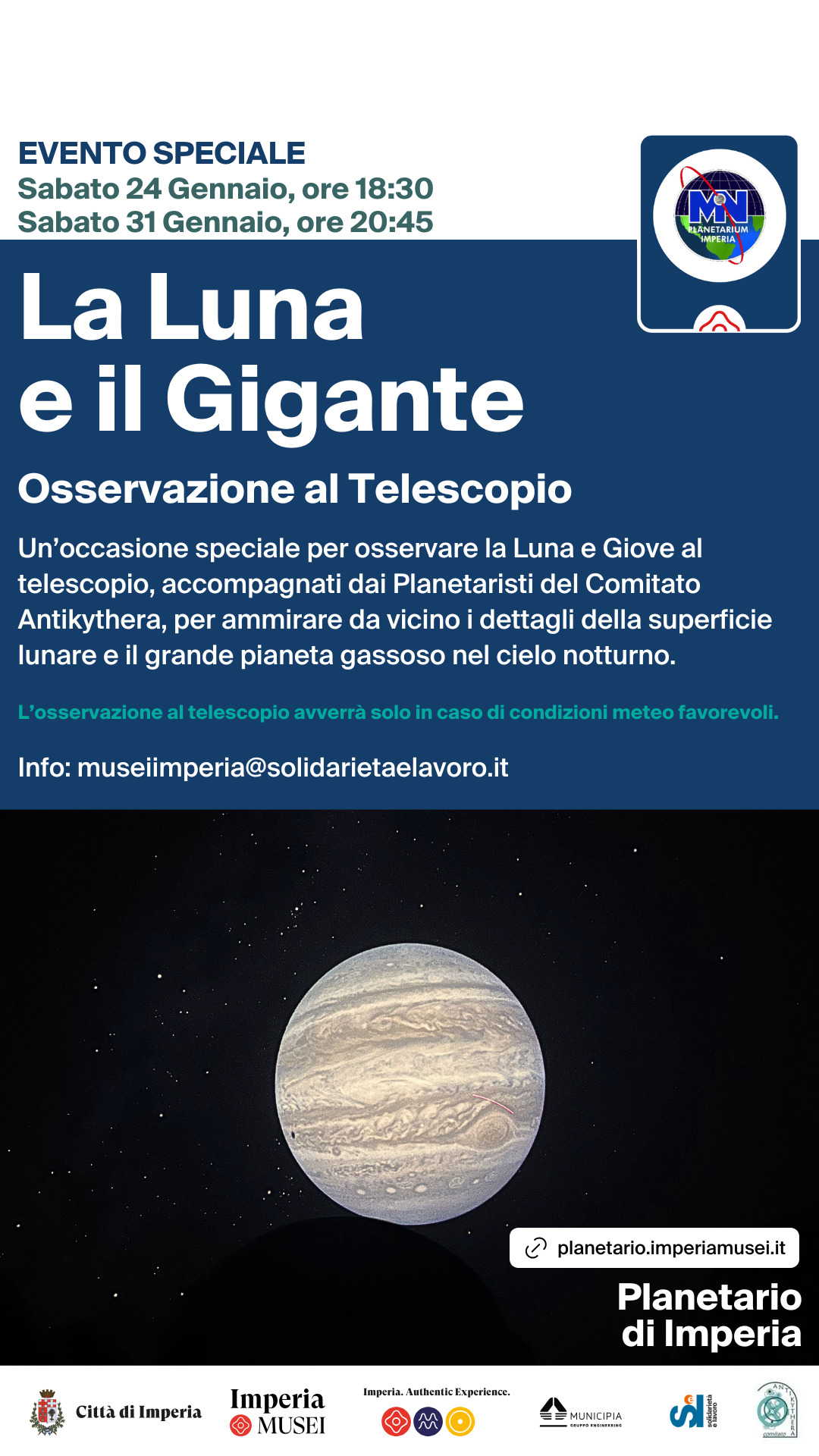 Sabato 24 Gennaio alle ore 18:30 e Sabato 31 Gennaio alle ore 20:45, il Planetario di Imperia ospiterà l'evento speciale "La Luna e il Gigante": un’occasione speciale per osservare la Luna e Giove al telescopio, accompagnati dai Planetaristi del Comitato Antikythera, per ammirare da vicino i dettagli della superficie lunare e il grande pianeta gassoso nel cielo notturno.