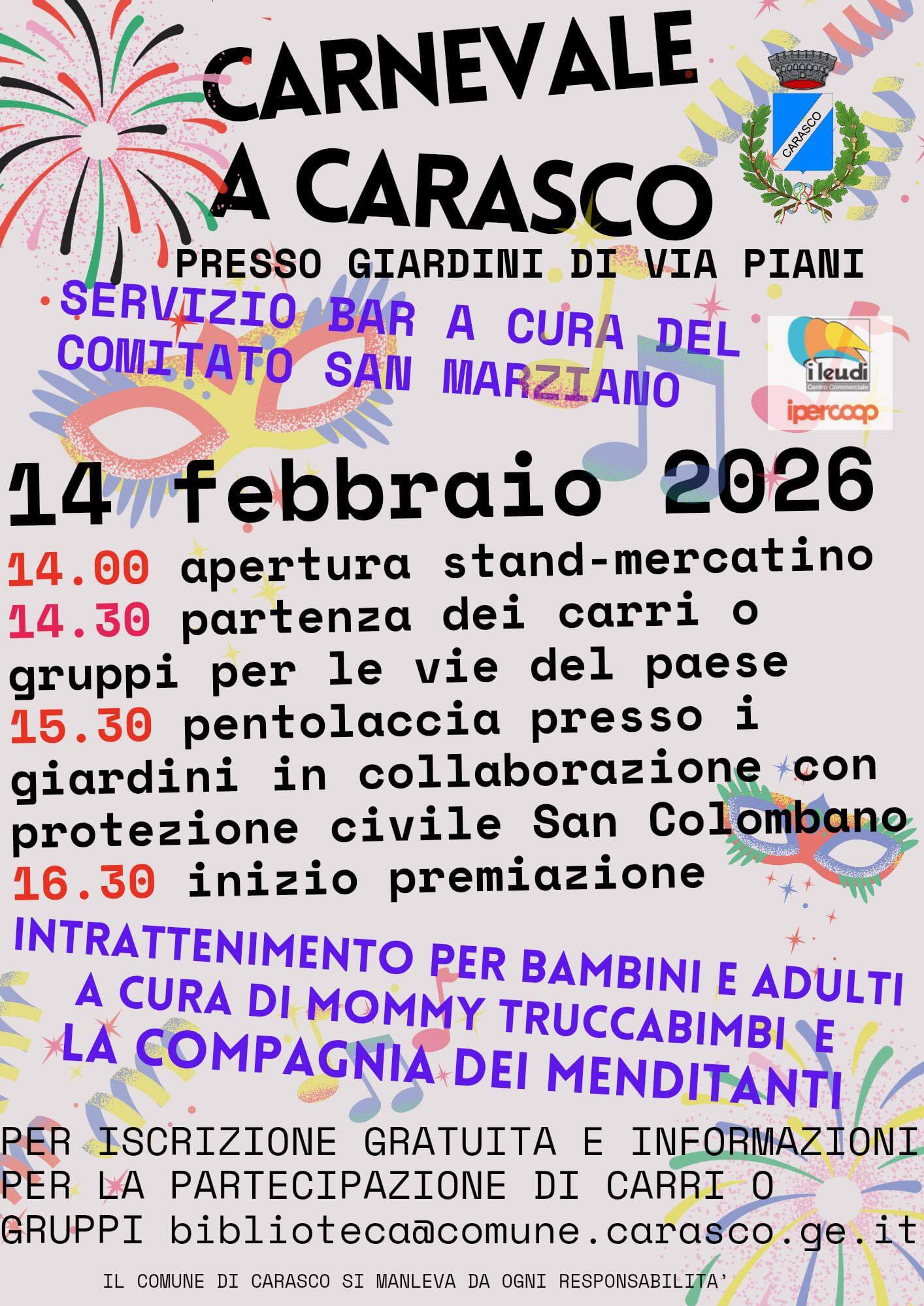 PER ISCRIZIONE GRATUITA E INFORMAZIONI PER LA PARTECIPAZIONE DI CARRI O GRUPPI biblioteca@comune.carasco.ge.it