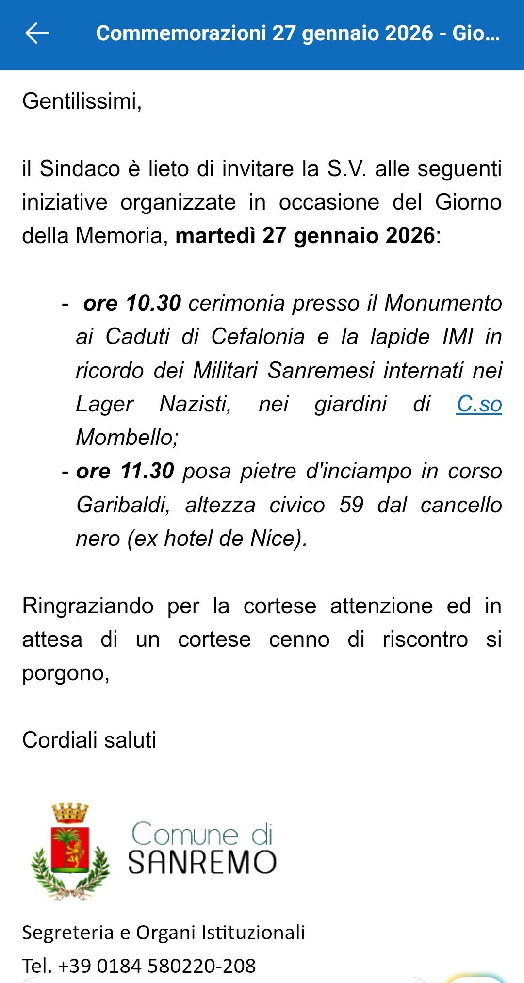 Il Sindaco è lieto di invitare la S.V. alle seguenti iniziative organizzate in occasione del Giorno della Memoria, martedì 27 gennaio 2026: