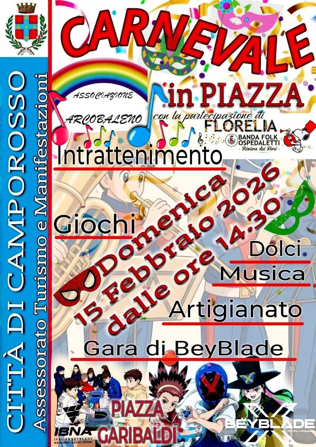 Domenica 15 febbraio 2026 dalle ore 14.30 in PIAZZA GARIBALDI “Carnevale in piazza” in collaborazione con l’Ass. Arcobaleno di Camporosso con la partecipazione di FLORELIA la BANDA FOLK DI OSPEDALETTI.