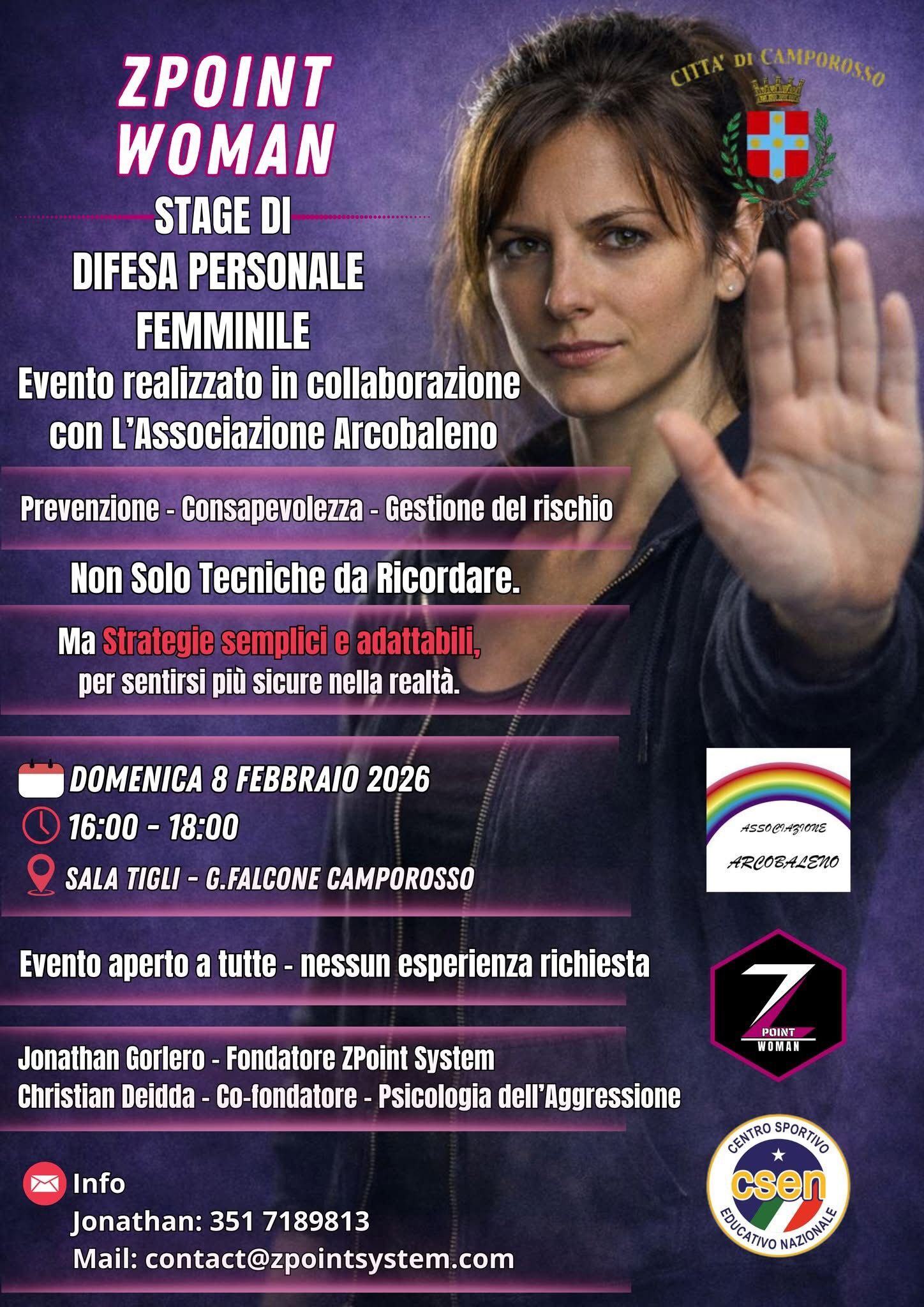 Domenica 8 febbraio 2026 dalle ore 16.00 alle ore 18.00 presso il Centro Polivalente G. Falcone a Comune di Camporosso “Stage di difesa personale femminile” in collaborazione con l’Ass. Arcobaleno di Camporosso.