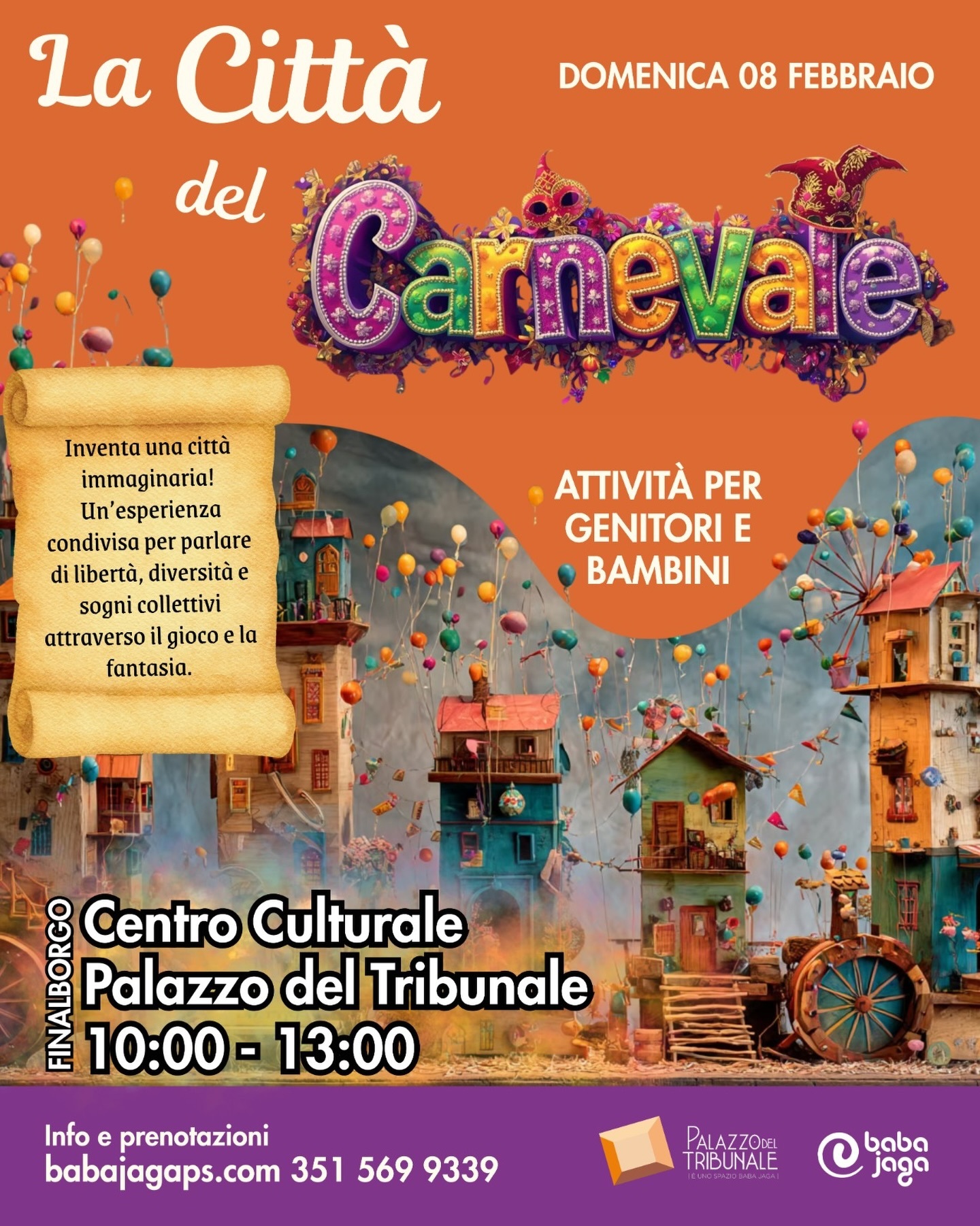 Nel nostro laboratorio, le regole diventano gioco. Ogni famiglia crea, esplora e si lascia guidare dalla fantasia per costruire insieme una Città di Carnevale: un luogo dove non ci sono confini, dove ogni angolo racconta una storia di libertà e trasformazione. 🏙️🌟