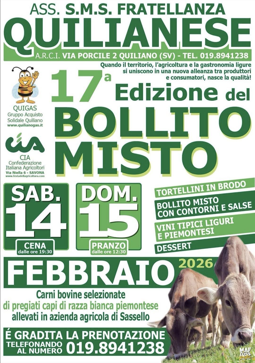 È gradita la prenotazione telefonando al numero 019.8941238