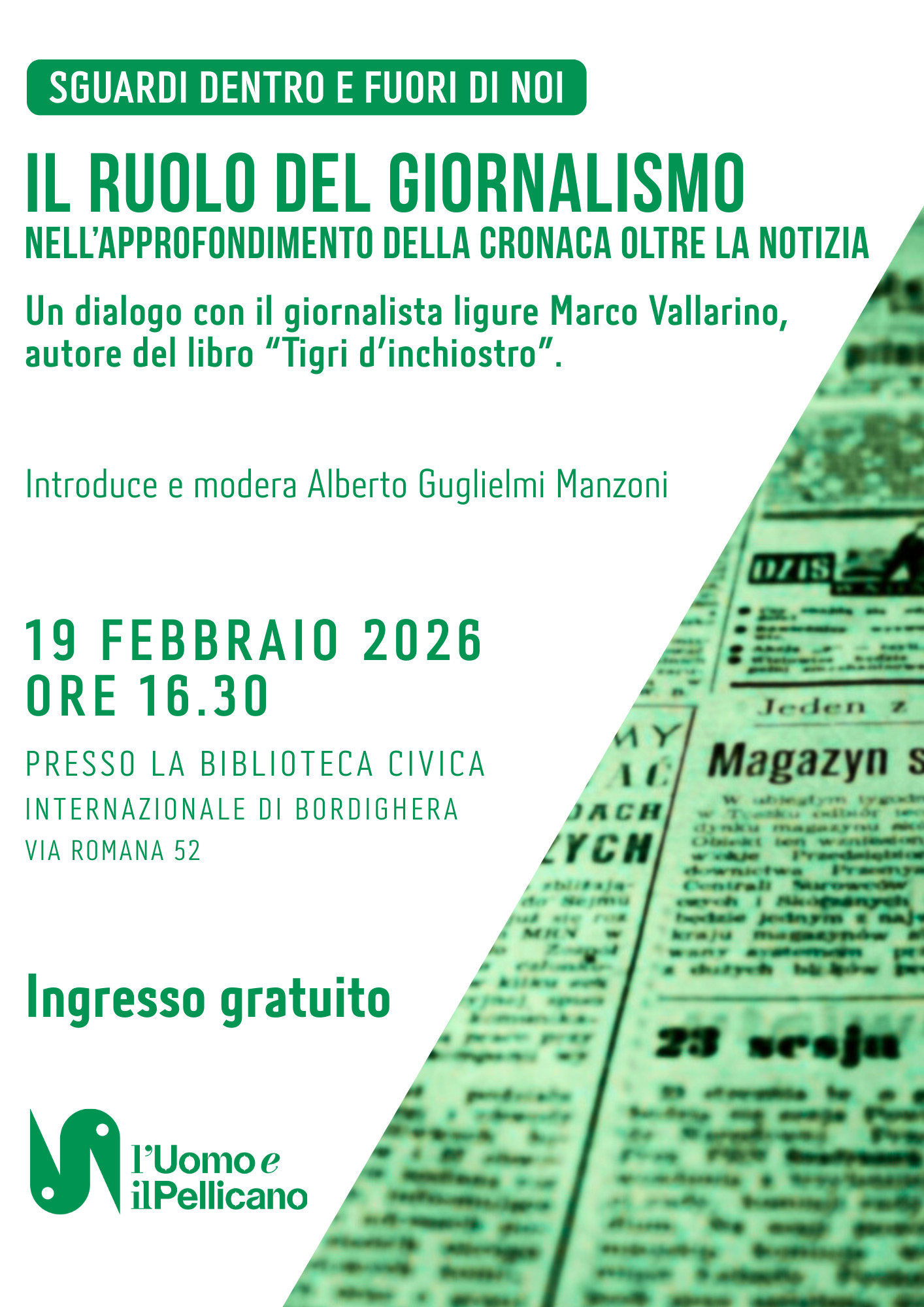 L'evento, promosso dalla Fondazione "L'Uomo e il Pellicano", all'interno del ciclo "Sguardi dentro e fuori di noi", vedrà la partecipazione del giornalista e scrittore ligure Marco Vallarino, autore del libro "Tigri d'inchiostro", in un intervento dal titolo: "Il ruolo del giornalismo nell’approfondimento della cronaca oltre la notizia".