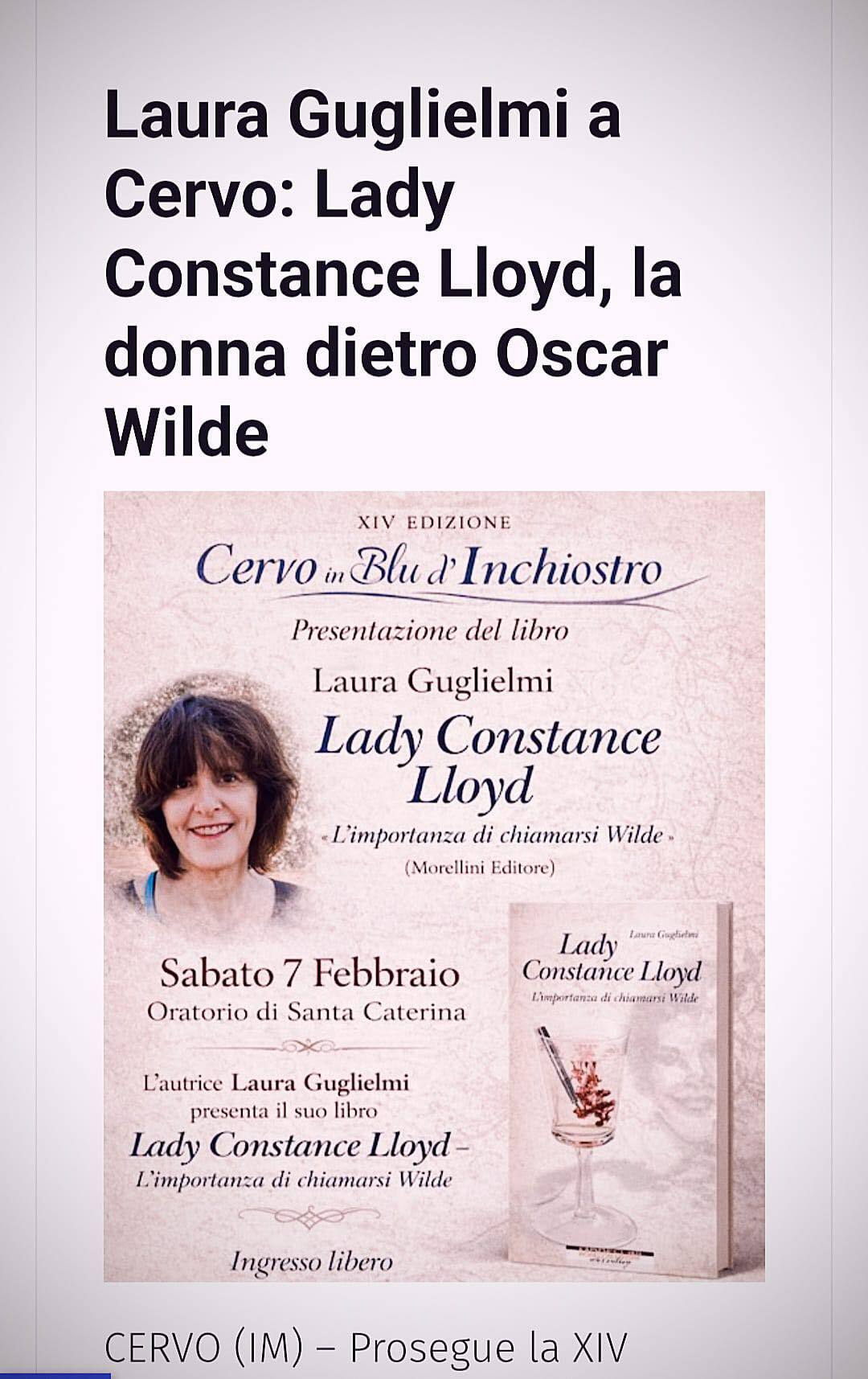 La XIV edizione di Cervo in Blu d’Inchiostro 2026 prosegue sabato 7 febbraio, alle ore 17, all’Oratorio di Santa Caterina, con la giornalista e scrittrice Laura Guglielmi, che presenterà il suo libro Lady Constance Lloyd – L’importanza di chiamarsi Wilde (Morellini Editore).