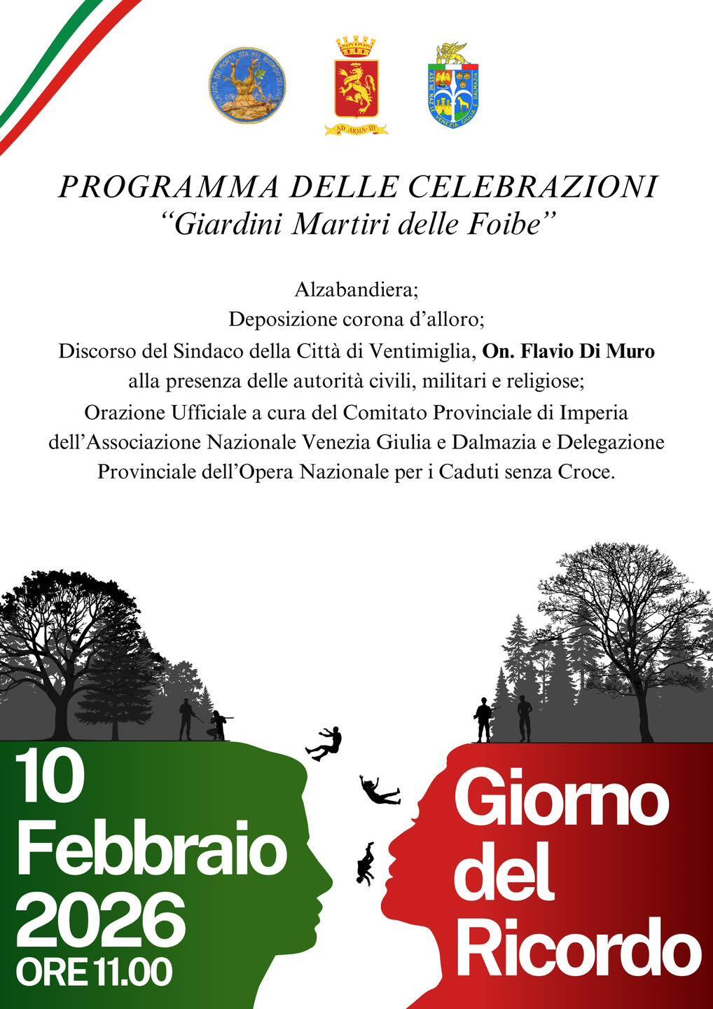 Cerimonia pubblica e solenne Martedì 10 Febbraio alle ore 11:00 presso i giardini Martiri delle Foibe in Via Lamboglia.