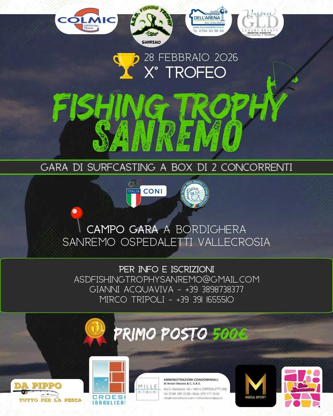 Il 28 Febbraio 2026 torna il X° Fishing Trophy Sanremo, gara di surfcasting a coppie sul tratto Sanremo – Ospedaletti – Bordighera – Vallecrosia.