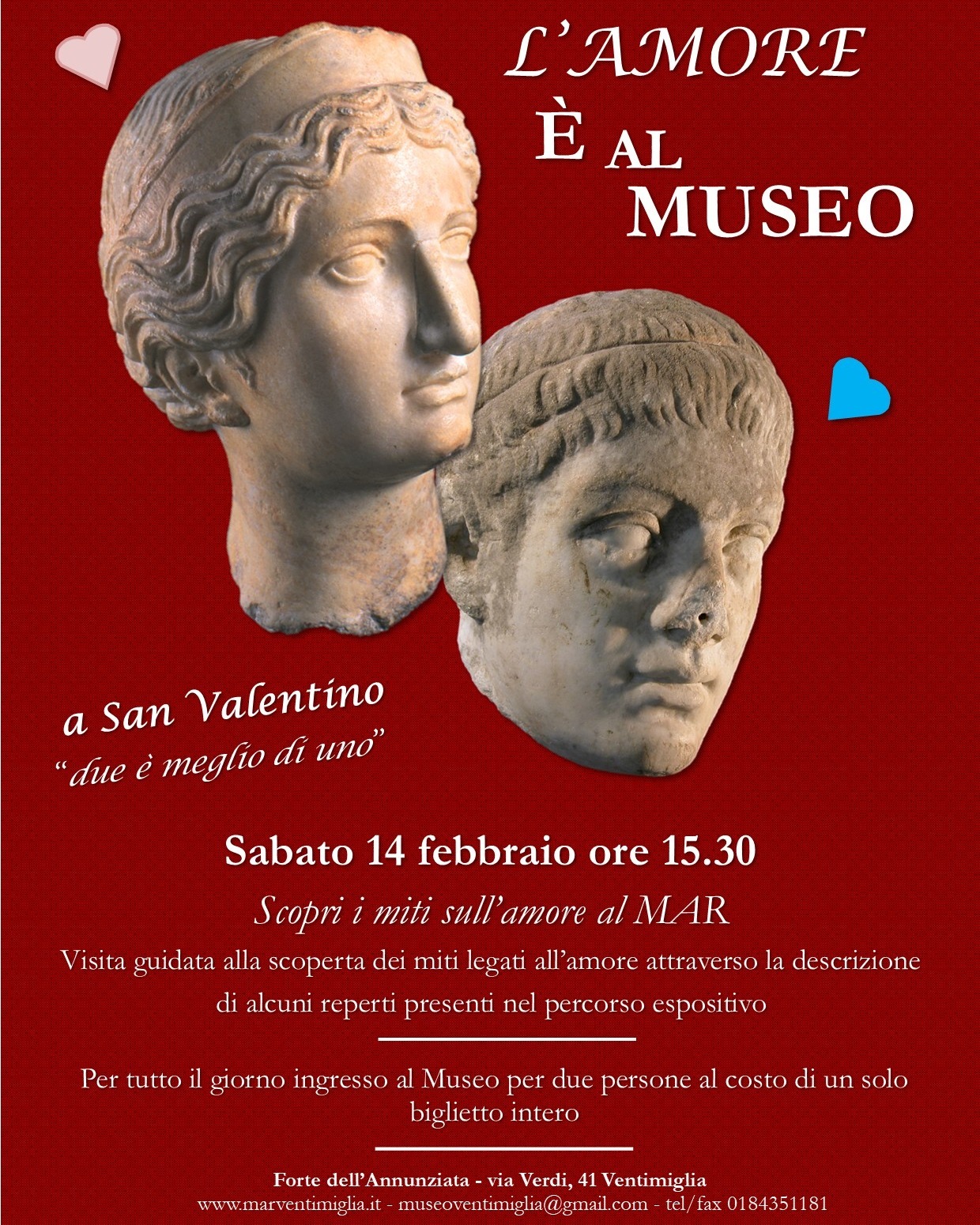 Il Museo Civico di Ventimiglia celebrerà la festa degli innamorati, ma anche della cultura e della storia, con un ingresso speciale riservato alle coppie al prezzo di un solo biglietto (ingresso gratuito per i bambini sino a 14 anni), sabato dalle ore 9.00 alle 12.30 e dalle 15.00 alle 17.00.