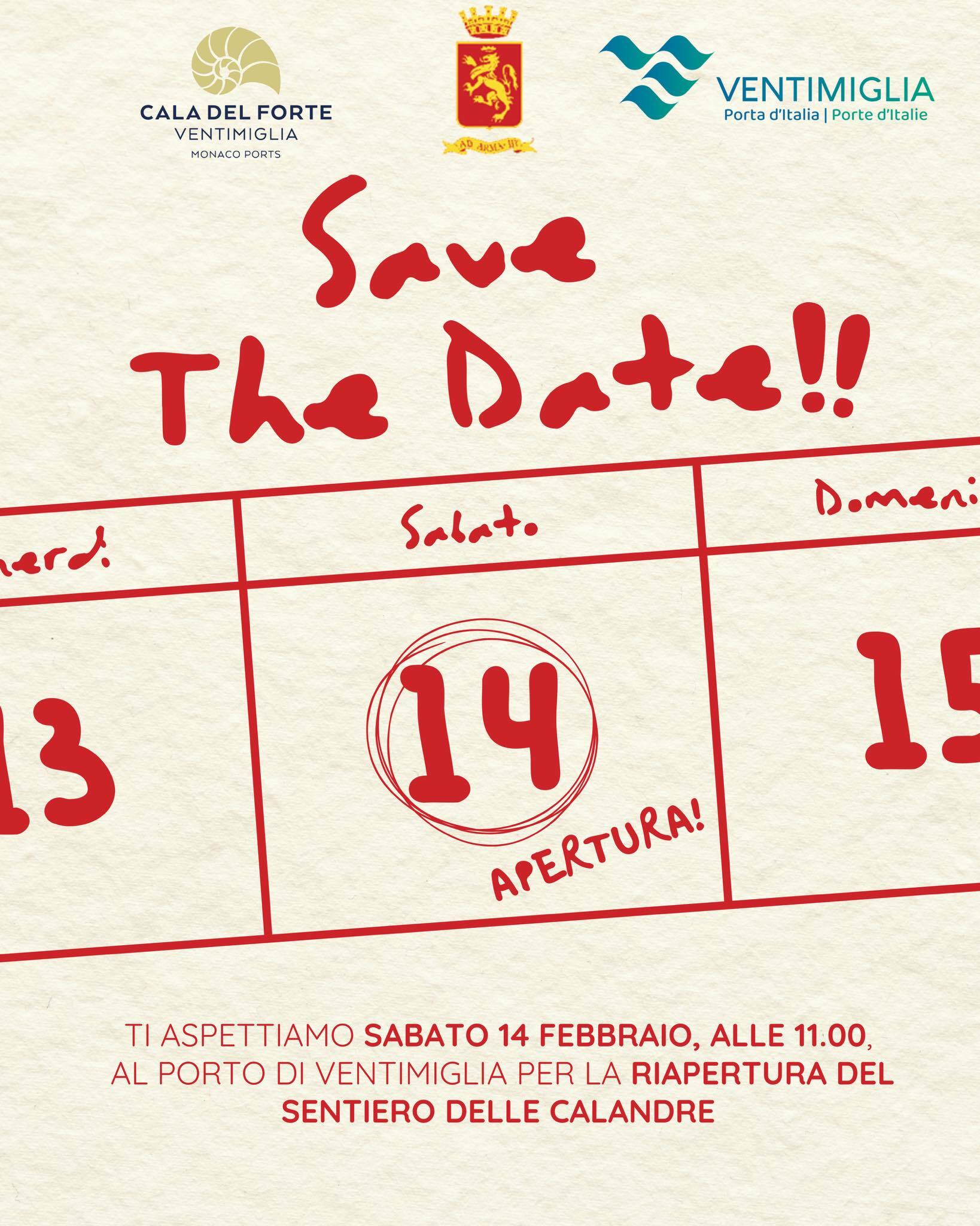 ✨ Sabato 14 febbraio, alle ore 11.00, presso il Porto di Ventimiglia, si terrà l’inaugurazione e la riapertura del tratto del Sentiero delle Calandre, rimasto chiuso per molti anni.