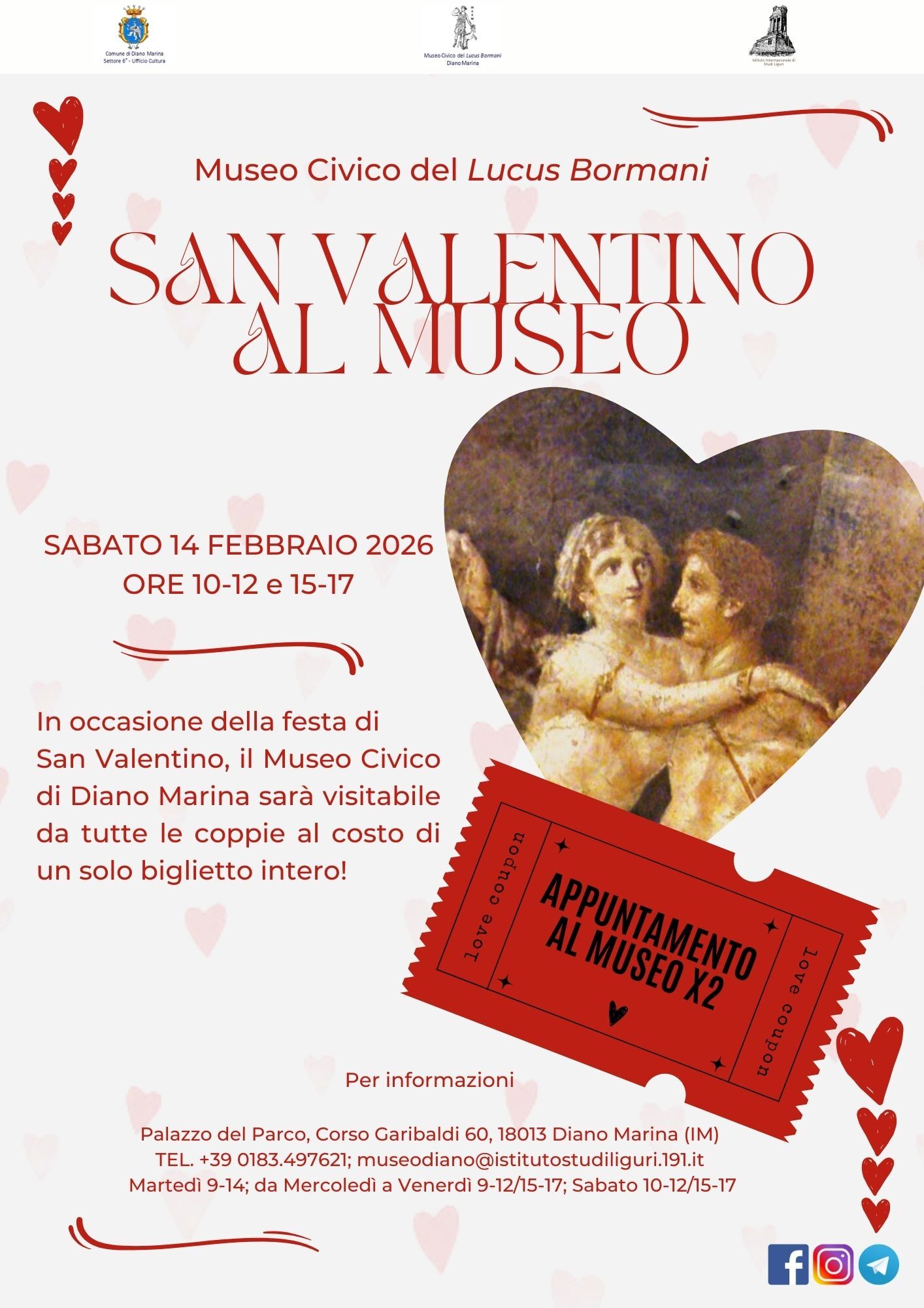 In occasione della Festa di San Valentino, sabato 14 febbraio dalle 10 alle 12 e dalle 15 alle 17, il Museo Civico del Lucus Bormani di Diano Marina sarà visitabile da tutte le coppie al costo di un solo biglietto per due.