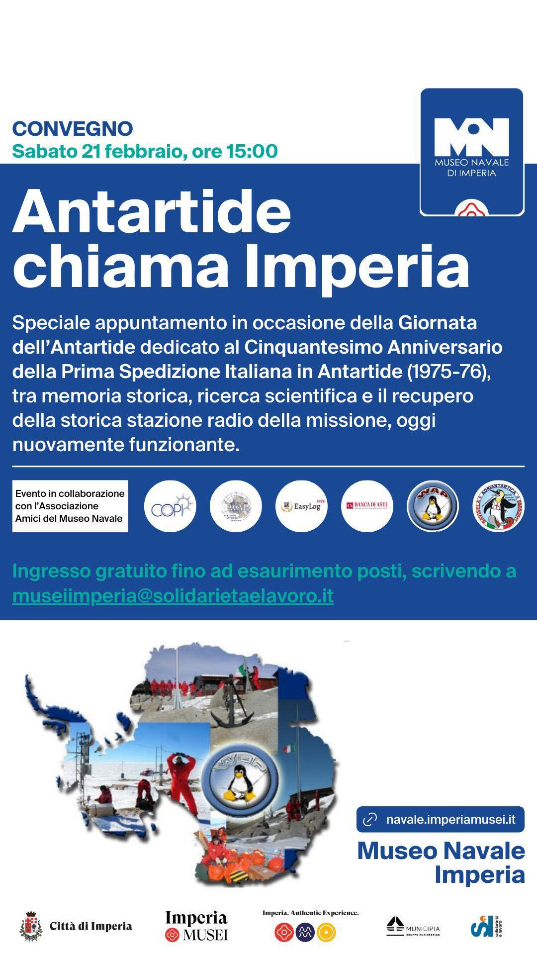 Sabato 21 Febbraio, alle ore 15:00, presso l’Auditorium del Museo Navale di Imperia, in occasione della Giornata dell’Antartide, si terrà un convegno dedicato al Cinquantesimo Anniversario della Prima Spedizione Italiana in Antartide (1975-76), missione privata guidata dall’industriale milanese Renato Cepparo e culminata con la realizzazione della Base Giacomo Bove, prima base italiana nel continente.