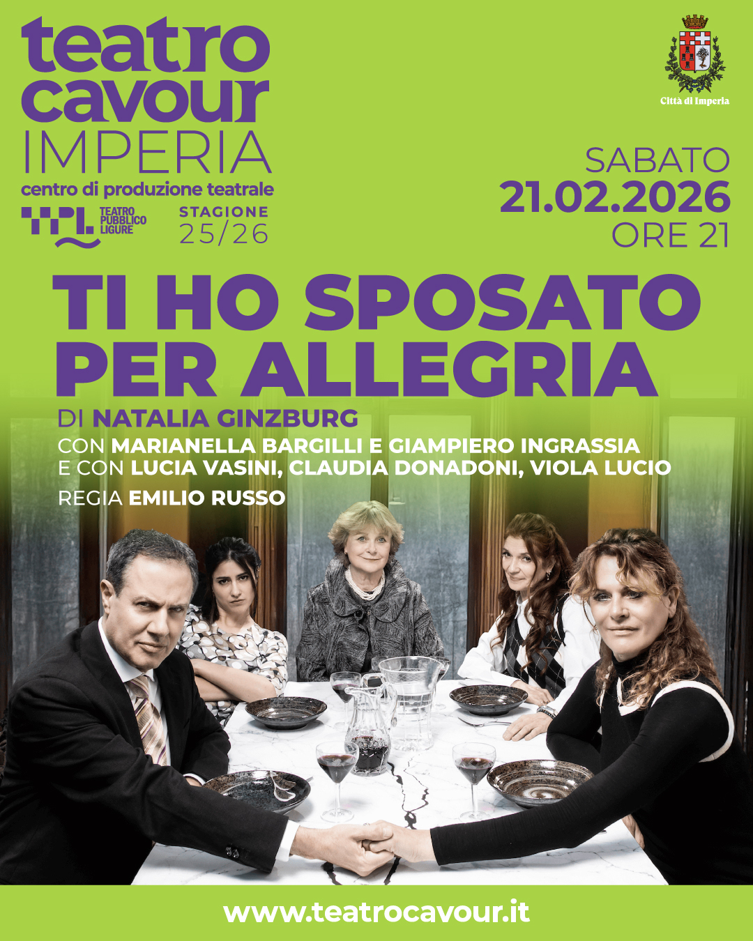 Ti ho sposato per allegria, prima commedia scritta da Natalia Ginzburg nel 1965, è un testo che mette a nudo la vita di coppia con una sincerità spiazzante. Giuliana e Pietro sono marito e moglie da appena sette giorni. Lei irregolare, inquieta, imprevedibile. Lui apparentemente stabile, ma non privo di ambiguità. Intorno a loro una famiglia, convenzioni sociali, abitudini quotidiane e una realtà che cambia.