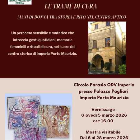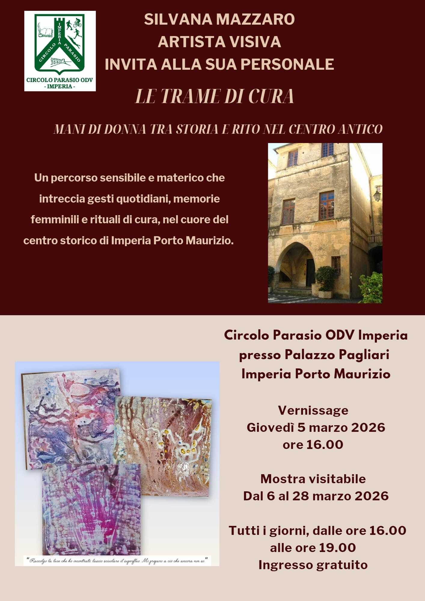 Nelle sale storiche di Palazzo Pagliari, dimora nobiliare che ospita il Circolo Parasio, prende forma Trame di cura, la nuova mostra personale dell’artista Silvana Mazzaro. Un percorso che unisce ceramiche, tessili dipinti a mano e pitture astratte, in un dialogo intimo con la storia del centro antico di Imperia.