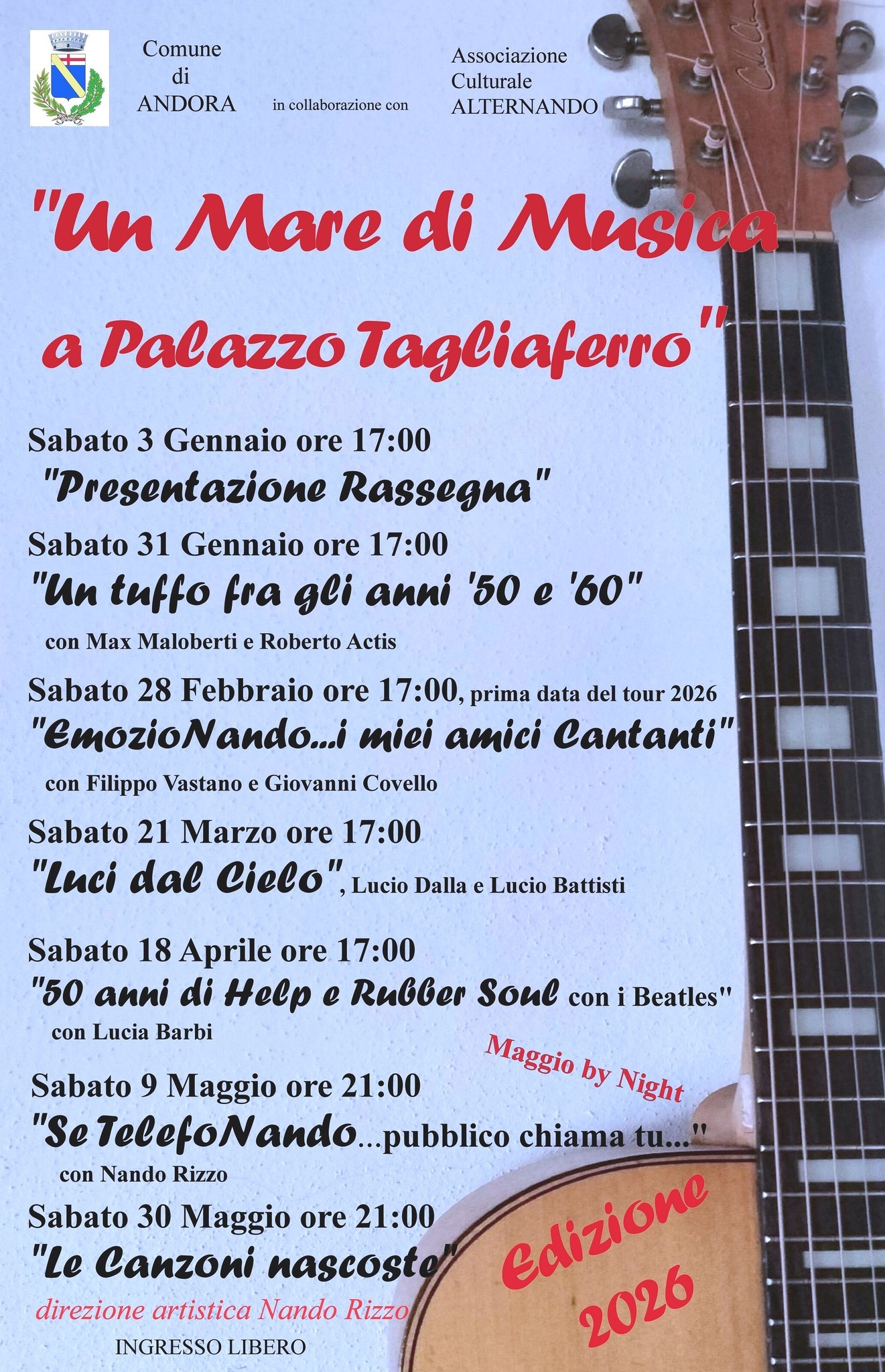 Il Comune di ANDORA in collaborazione con Associazione Culturale ALTERNANDO presenta la nuova edizione di "Un Mare di Musica a Palazzo Tagliaferro" Edizione 2026