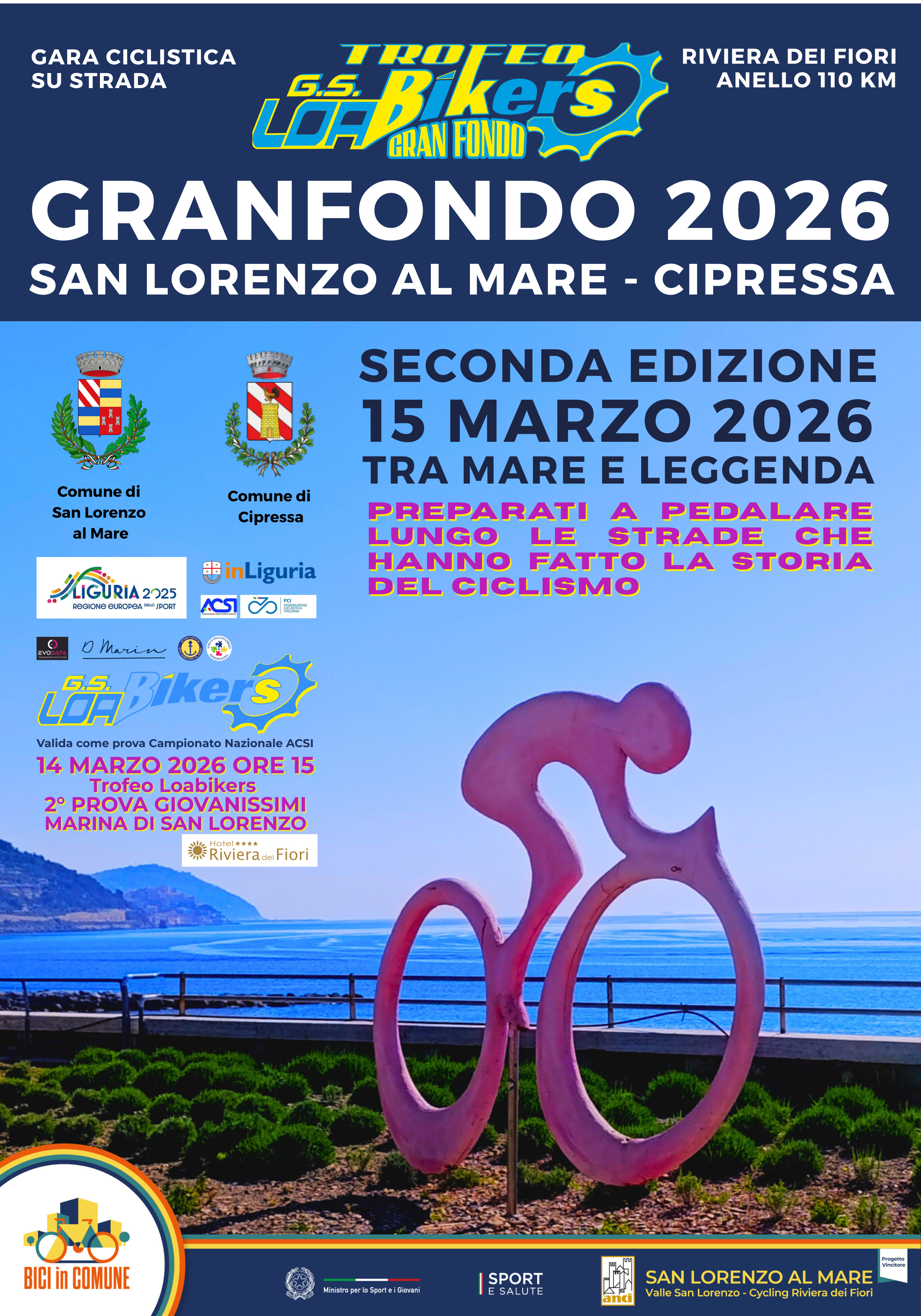 Il 15 marzo 2026 San Lorenzo al Mare e Cipressa ospitano la seconda edizione del Trofeo G.S. Loabikers: 110 chilometri tra mare, sport e leggenda del ciclismo.