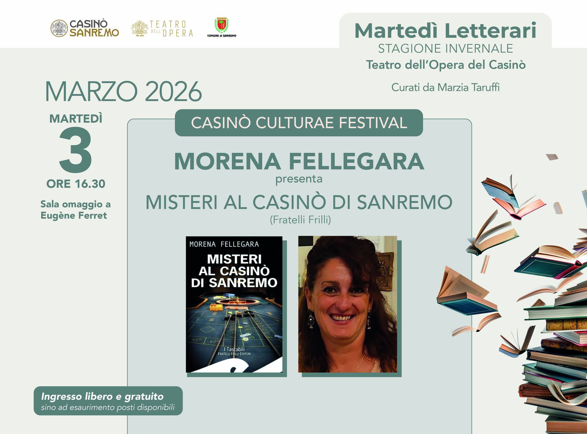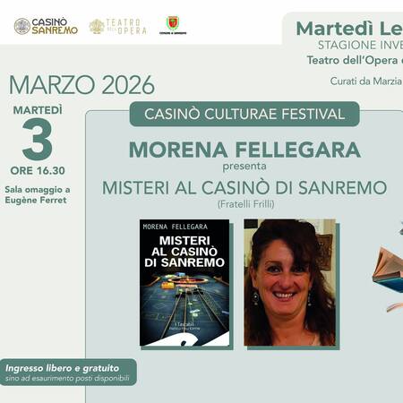 Martedì 3 marzo ore 16.30 nella sala Omaggio a Eugene Ferret del Casinò, la scrittrice Morena Fellegara illustrerà il suo romanzo giallo: ”Misteri al Casinò di Sanremo (Fratelli Frilli) Targa Premio Casinò di Sanremo Antonio Semeria 2025.
