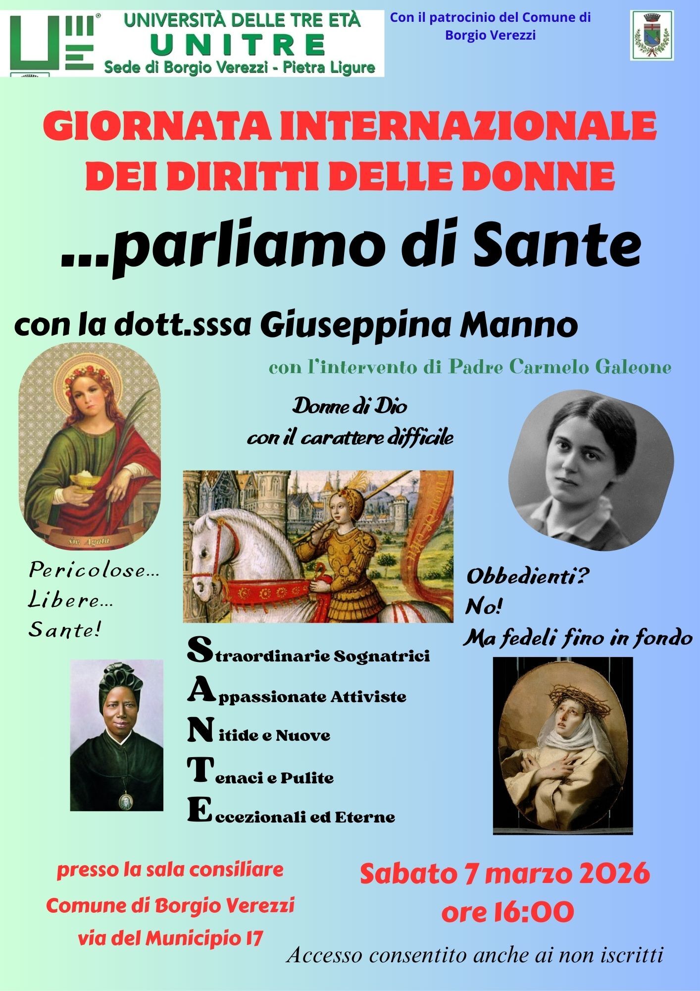 L'Unitre Borgio Verezzi e Pietra Ligure organizza un pomeriggio formativo sabato 7 marzo, alle ore 16:00, presso la sala consiliare del Comune di Borgio Verezzi, in via del Comune 17, con la conferenza della Dott.ssa Giuseppina Manno sul tema “… parliamo di Sante”, che non sono supereroi inarrivabili, ma donne che hanno amato Dio e il prossimo in modo straordinario, condividendo fatiche e debolezze umane, in sintesi la "santa" rappresenta un ponte tra l'umanità e il divino, una testimonianza di come l'amore e la fede possano trasformare la vita concreta.