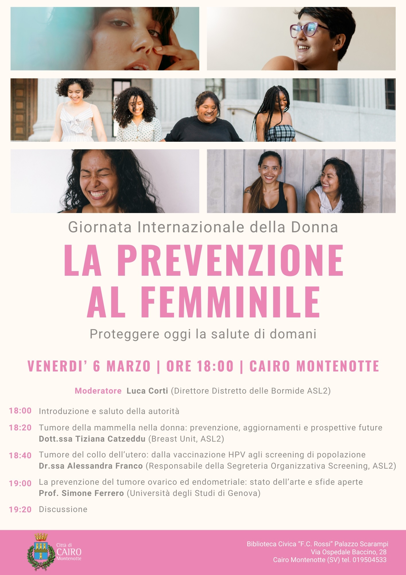 Venerdì 6 marzo, alle ore 18, presso la Biblioteca civica di Palazzo Scarampi, dunque, si terrà il convegno “La prevenzione al femminile. Proteggere oggi la salute di domani”. Per l’occasione, moderata da Luca Corti (Direttore Distretto delle Bormide ASL2), la Dott.ssa Tiziana Catzeddu (Breast Unit, ASL2) tratterà di “Tumore della mammella nella donna: prevenzione, aggiornamenti e prospettive future”; la Dr.ssa Alessandra Franco (Responsabile della Segreteria Organizzativa Screening, ASL2) relazionerà su “Tumore del collo dell’utero: dalla vaccinazione HPV agli screening di popolazione”; il Prof. Simone Ferrero (Università degli Studi di Genova) parlerà de “La prevenzione del tumore ovarico ed endometriale: stato dell’arte e sfide aperte”; al termine è prevista una discussione sui temi trattati.