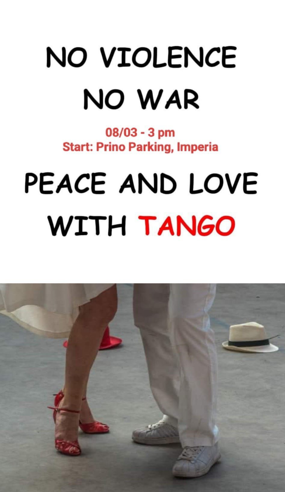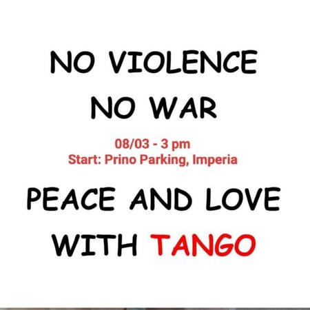 Sperimentato il divertimento e il senso di comunità attiva che si è creato durante il Flashmob tanguero per San Valentino a Imperia, ne riproponiamo un altro - sempre a Imperia, zona Prino, contro ogni forma di violenza e di guerre - DOMENICA 8 MARZO ore 15, con ritrovo presso il grande PARCHEGGIO GRATUITO fronte mare del Prino (ingresso quasi di fronte al ristorante Da Lucio/Le Casette di via Lamboglia).