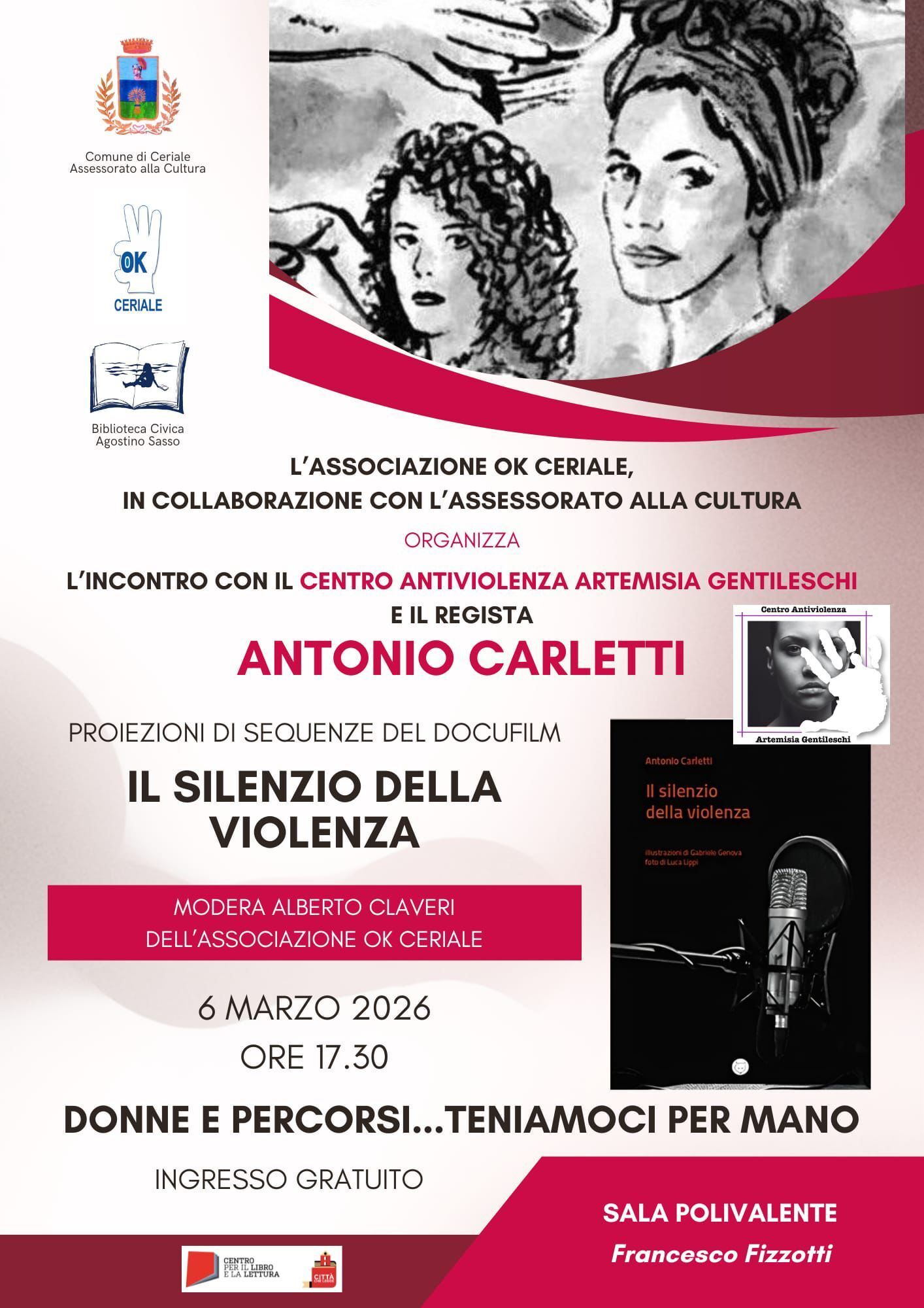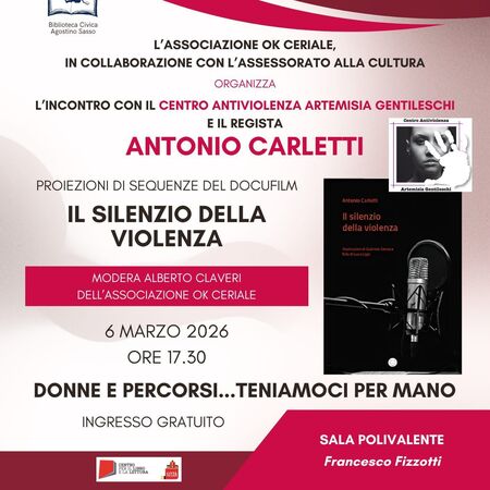 L’ASSOCIAZIONE OK CERIALE, IN COLLABORAZIONE CON L’ASSESSORATO ALLA CULTURA ORGANIZZA L’INCONTRO CON IL CENTRO ANTIVIOLENZA ARTEMISIA GENTILESCHI E IL REGISTA ANTONIO CARLETTI