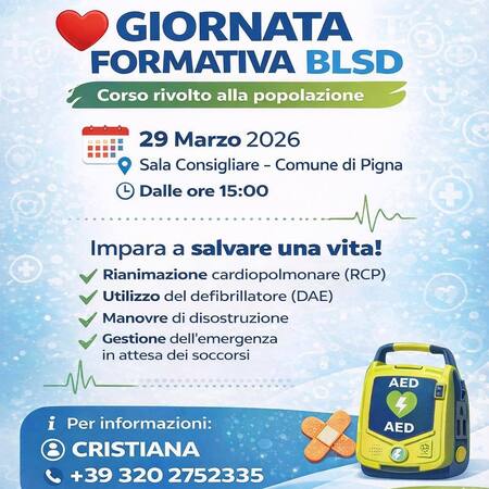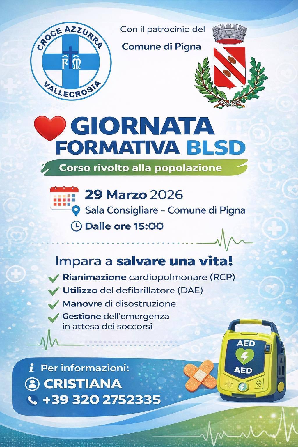 LA CROCE AZZURRA VALLECROSIA Con il patrocinio del Comune di Pigna organizza una ❤️ GIORNATA FORMATIVA BLSD Corso rivolto alla popolazione