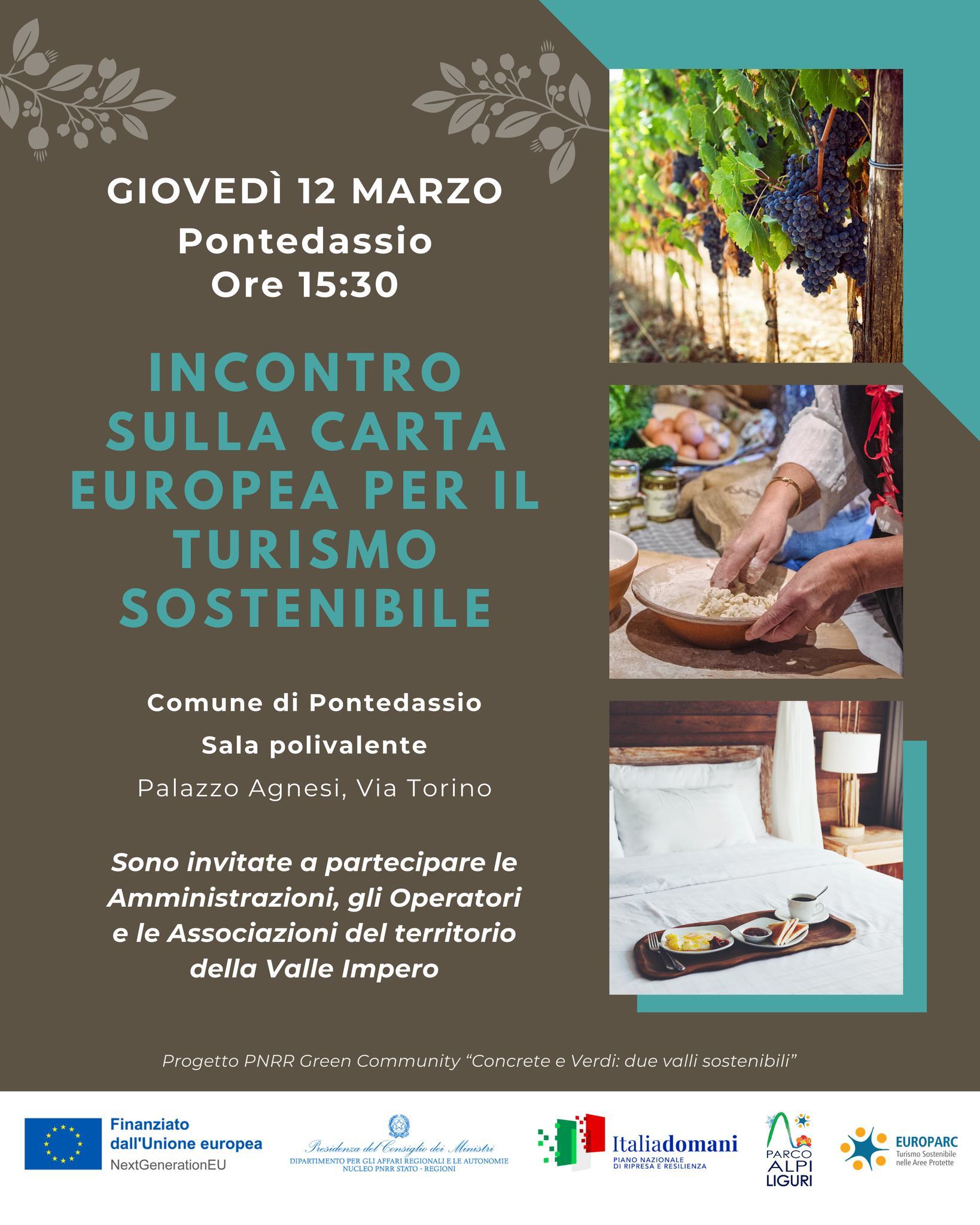 Il prossimo appuntamento, dedicato alla Carta Europea del Turismo Sostenibile (CETS), è in programma giovedì 12 marzo a Pontedassio, presso la Sala Polivalente del Comune, a cura dell'Ente Parco Naturale delle Alpi Liguri.
