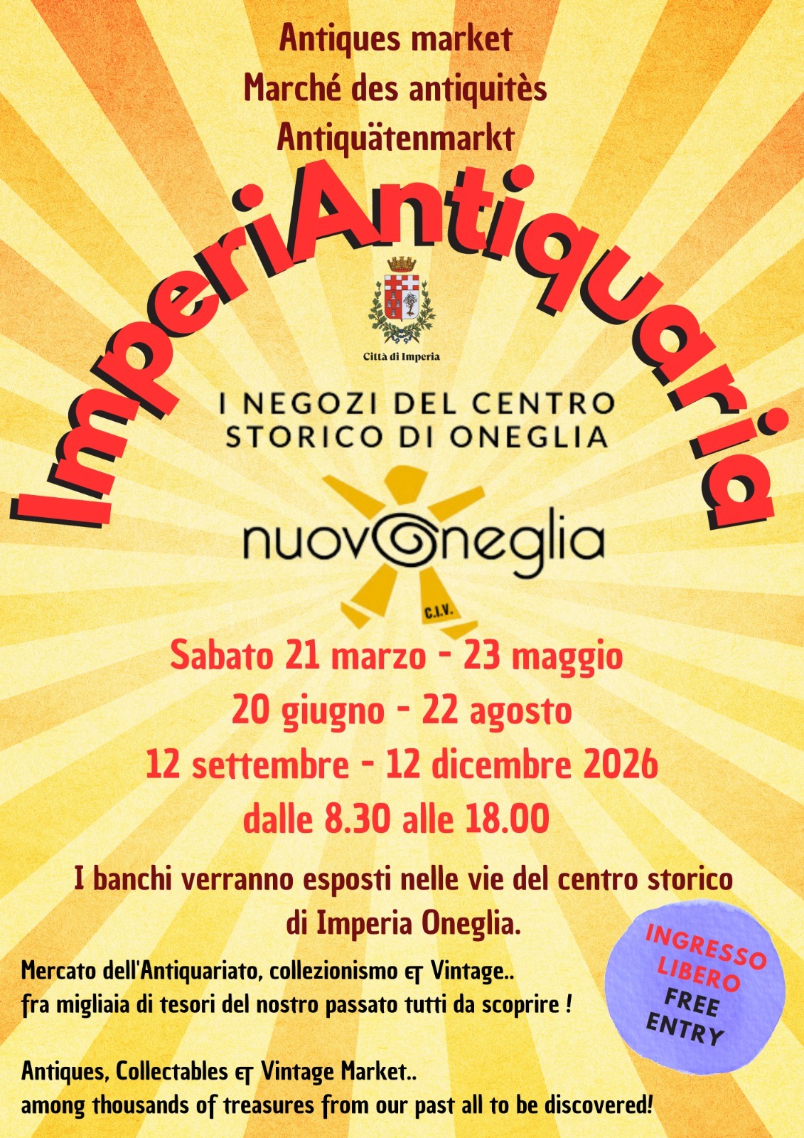 Ritorna infatti ImperiAntiquaria, il mercatino dell’arte e dell’antiquariato che si snoderà nelle vie del centro storico, organizzato dai commercianti del centro storico Civ NuovOneglia, con il patrocinio del Comune di Imperia.