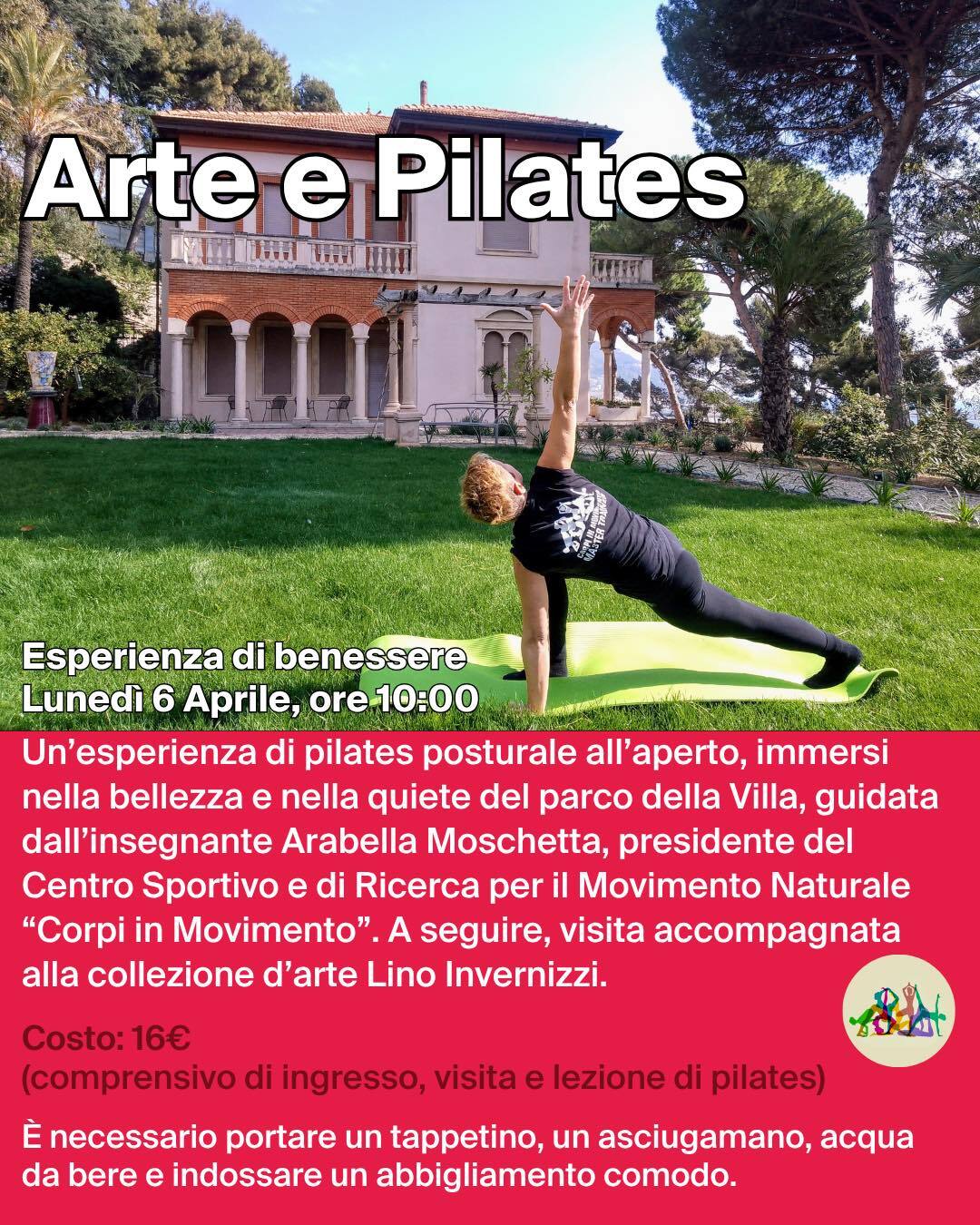 Un'esperienza di pilates posturale all'aperto, immersi nella bellezza e nella quiete del parco della Villa, guidata dall'insegnante Arabella Moschetta, presidente del Centro Sportivo e di Ricerca per il Movimento Naturale "Corpi in Movimento". A seguire, visita accompagnata alla collezione d'arte Lino Invernizzi.