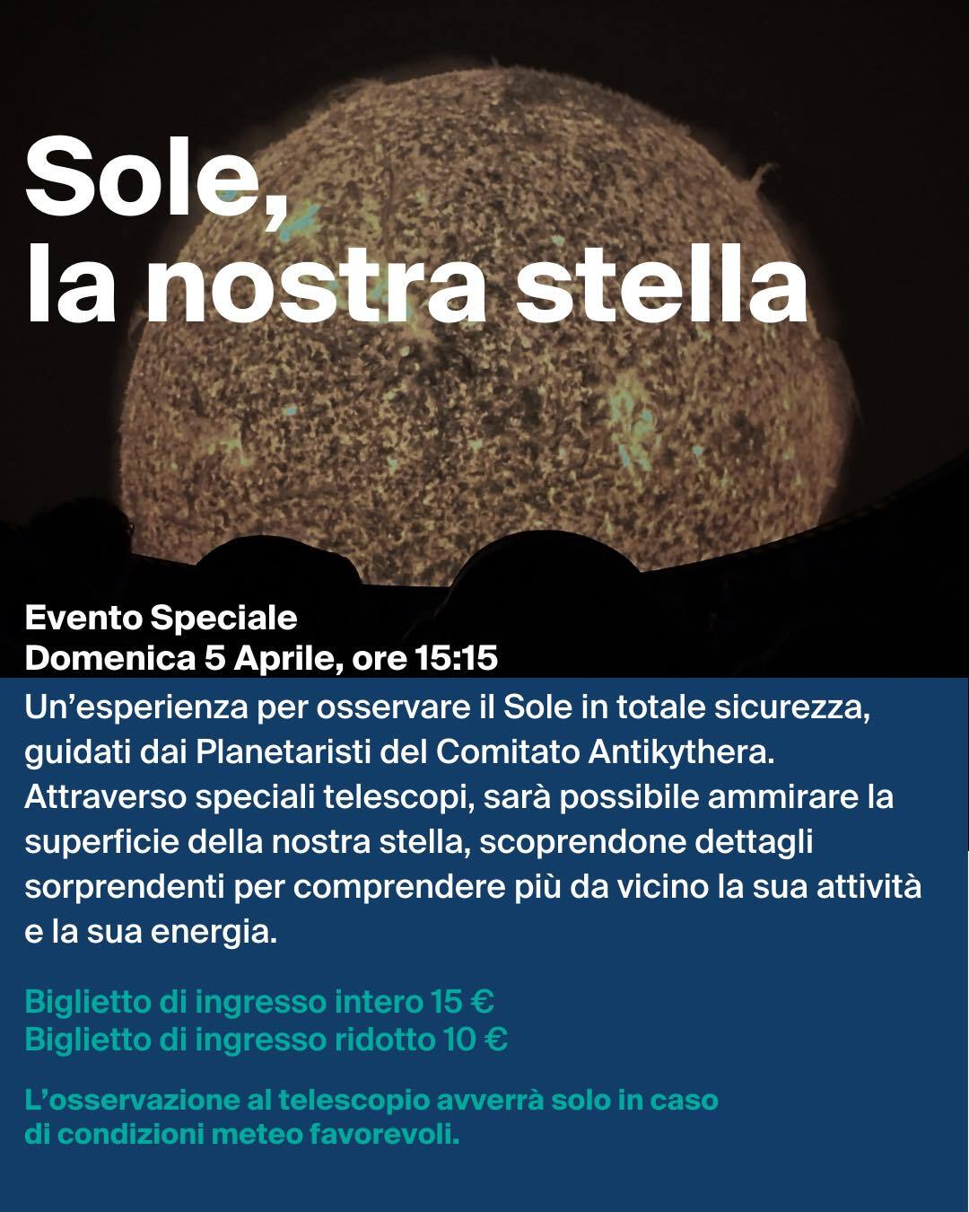 Un’esperienza per osservare il Sole in totale sicurezza, guidati dai Planetaristi del Comitato Antikythera. Attraverso speciali telescopi, sarà possibile ammirare la superficie della nostra stella, scoprendo dettagli sorprendenti per comprendere più da vicino la sua attività e la sua energia.