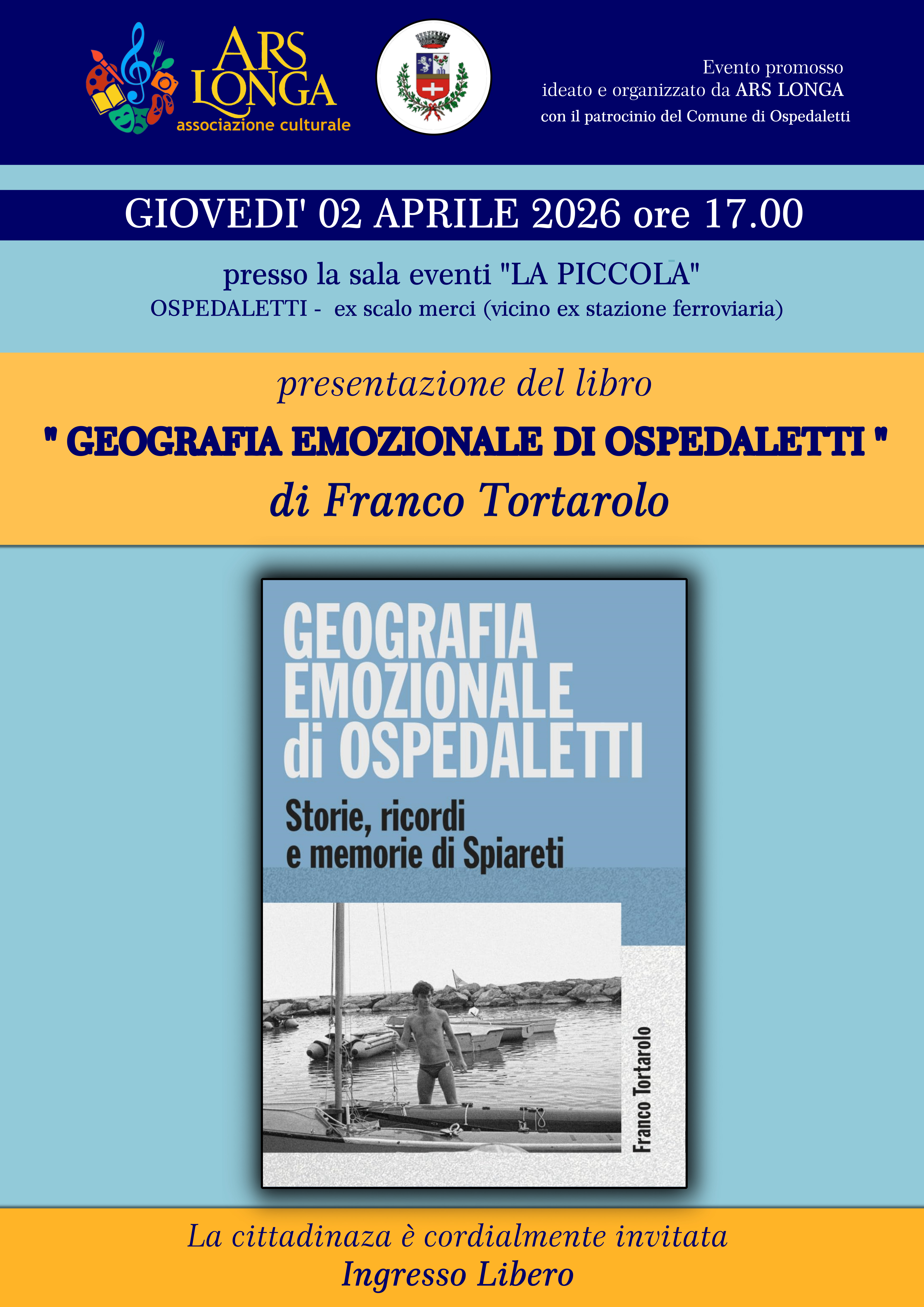 L'Associazione Culturale Ars Longa di Ospedaletti organizza un incontro letterario Giovedì 02 Aprile alle ore 17.00 presso "La Piccola" sala eventi di Ospedaletti. Un evento denso di ricordi e storie legate ad Ospedaletti messe a fuoco da Franco Tortarolo.
