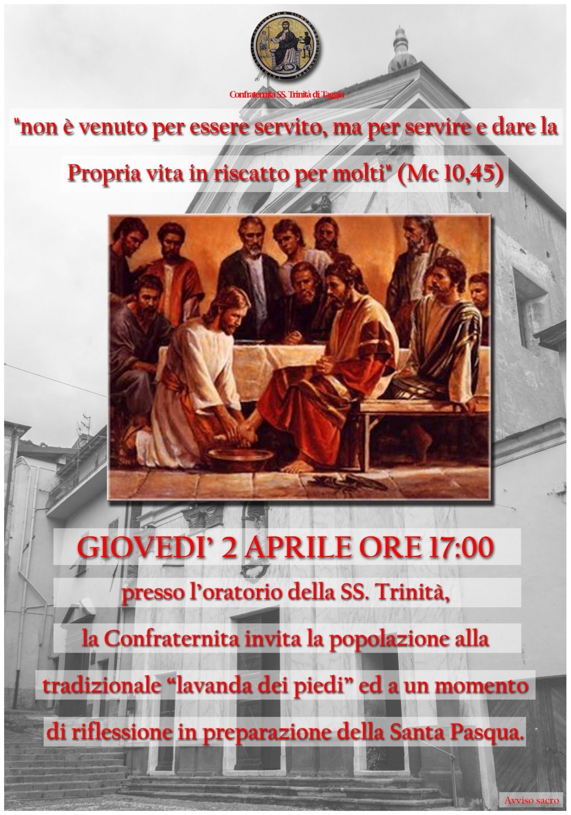 GIOVEDI' 2 APRILE ORE 17:00 presso l’oratorio della SS. Trinità, la Confraternita invita la popolazione alla tradizionale “lavanda dei piedi” ed a un momento di riflessione in preparazione della Santa Pasqua.