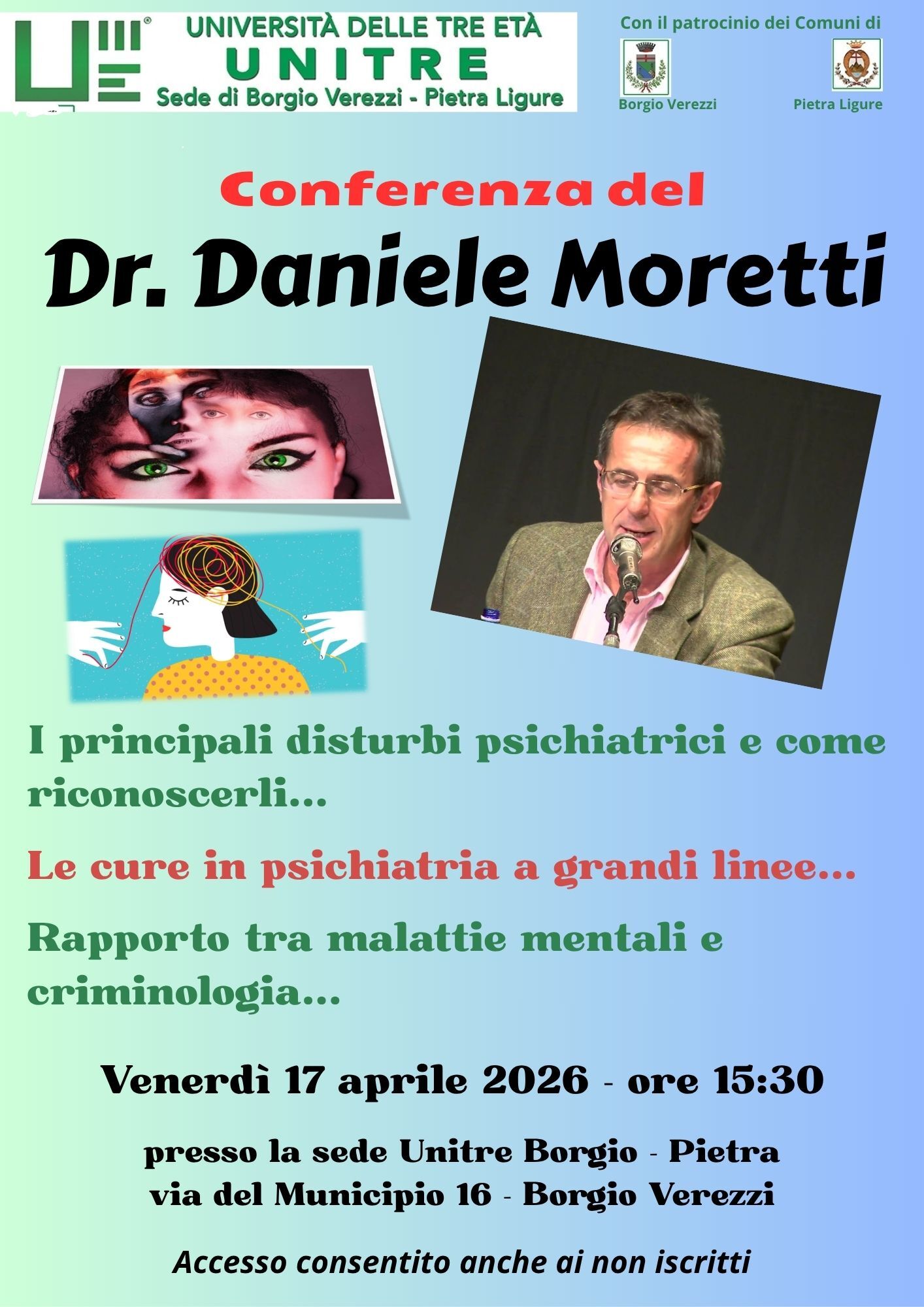 Venerdì 17 aprile 2026, alle ore 15:30, conferenza del dr. Daniele Moretti sul tema “I principali disturbi psichiatrici e come riconoscerli… Le cure in psichiatria a grandi linee… Rapporti tra malattie mentali e criminologia…”