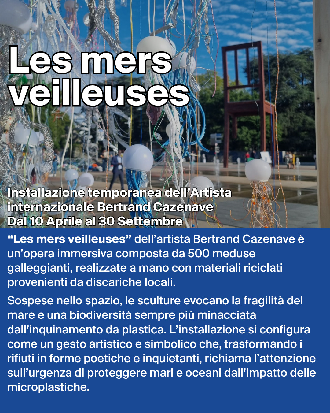 Sospese nello spazio, le sculture evocano la fragilità del mare e una biodiversità sempre più minacciata dall’inquinamento da plastica. L’installazione si configura come un gesto artistico e simbolico che, trasformando i rifiuti in forme poetiche e inquietanti, richiama l’attenzione sull’urgenza di proteggere mari e oceani dall’impatto delle microplastiche.
