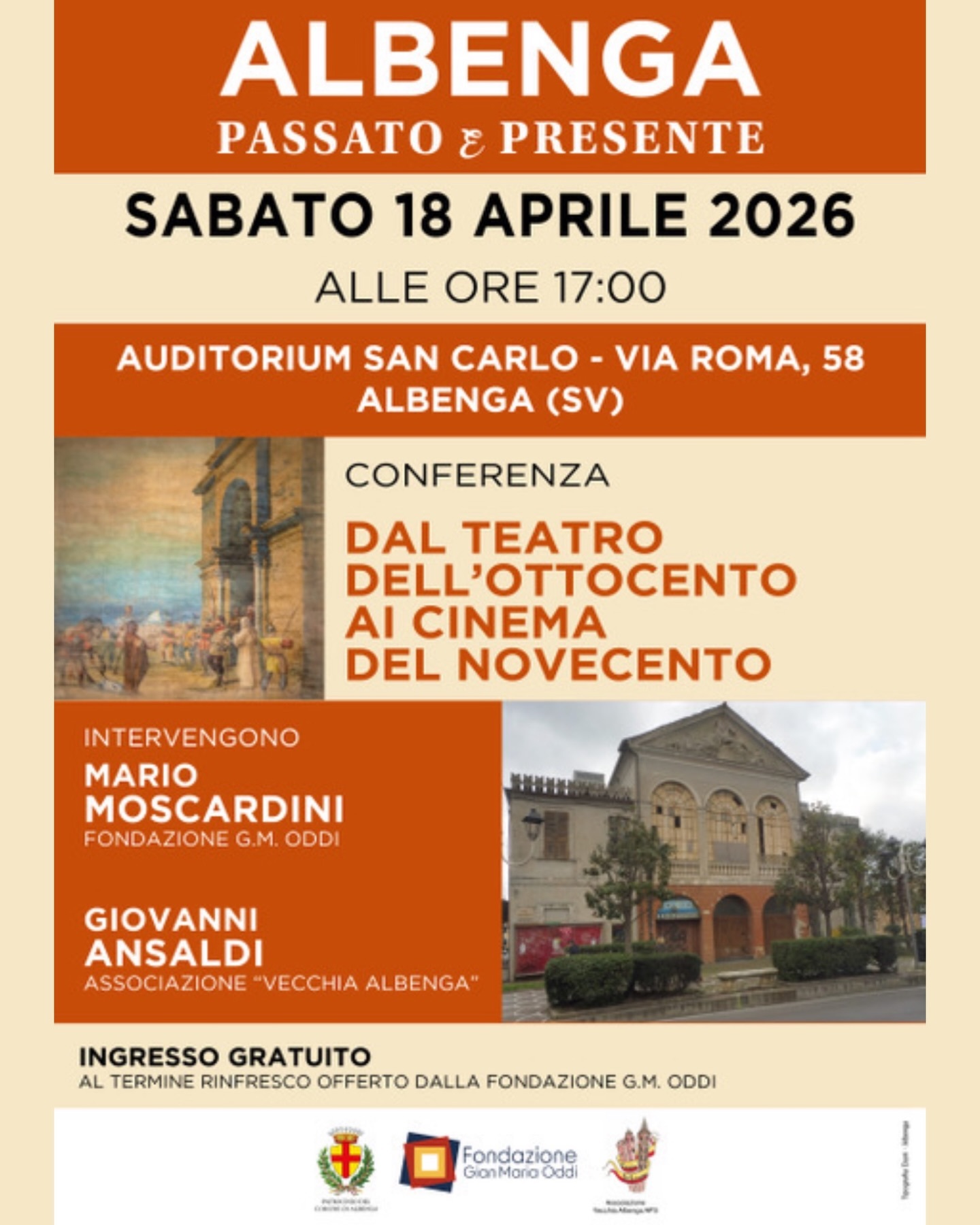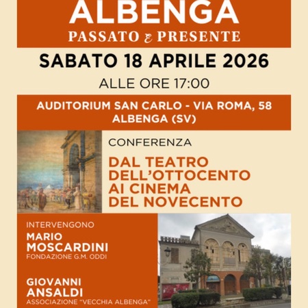La Fondazione G. M. Oddi, con il Patrocinio del Comune di Albenga, Assessorato Turismo e Cultura, per la Rassegna “Albenga Passato e Presente”, propone per Sabato 18 Aprile 2026 alle ore 17 🗓️🕔, nell’Auditorium San Carlo di Via Roma 58 📍, la conferenza “Albenga - Dal Teatro dell’Ottocento ai Cinema del Novecento” 🎭🎬.