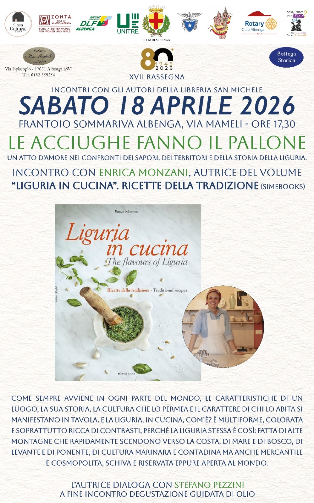 Sabato 18 aprile 2026, alle 17:30, al Frantoio Sommariva (Via Mameli – Albenga) vi aspettiamo per un nuovo appuntamento della XVII Rassegna.