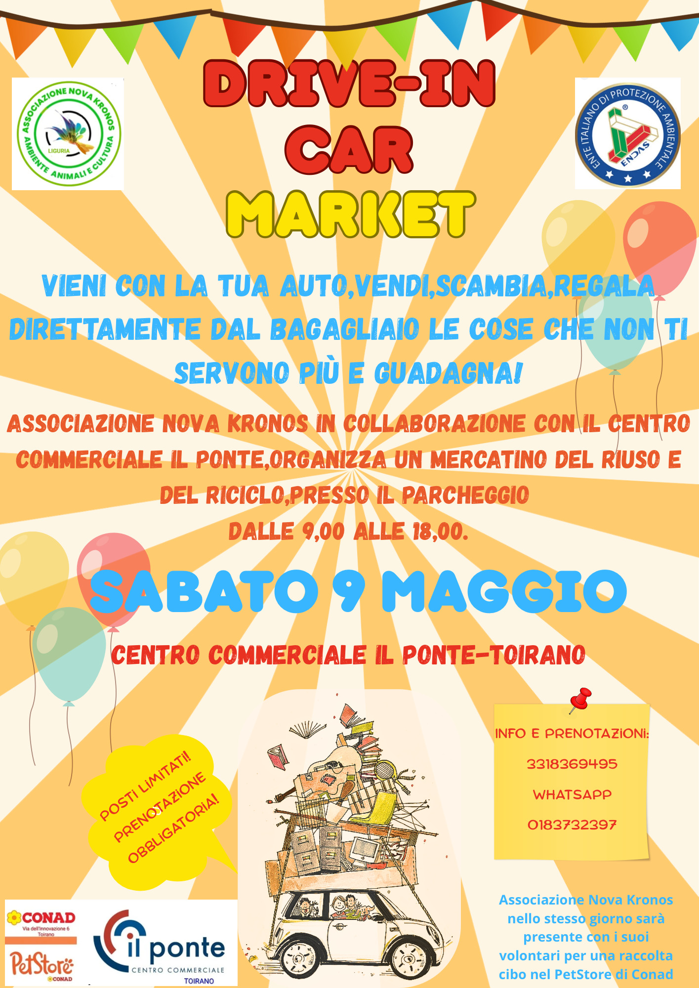Associazione Nova Kronos in collaborazione con il Centro Commerciale Il Ponte organizza un mercatino del Riuso e del Riciclo presso il parcheggio dalle ore 9,,00 alle 18,00. Prenotazione obbligatoria al 331 8369495 oppure whatsapp 0183 732397