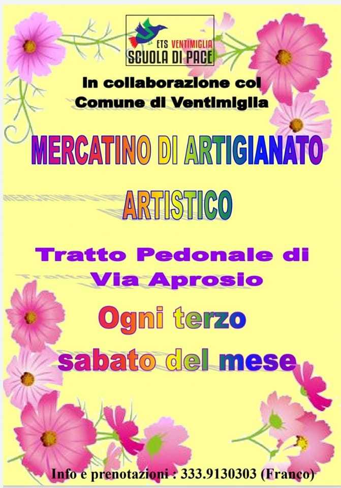 La Scuola di Pace in collaborazione con il Comune di Ventimiglia organizza ogni terzo sabato del mese un Mercatino di artigianato artistico nel tratto pedonale di Via Aprosio dalle ore 9.00.