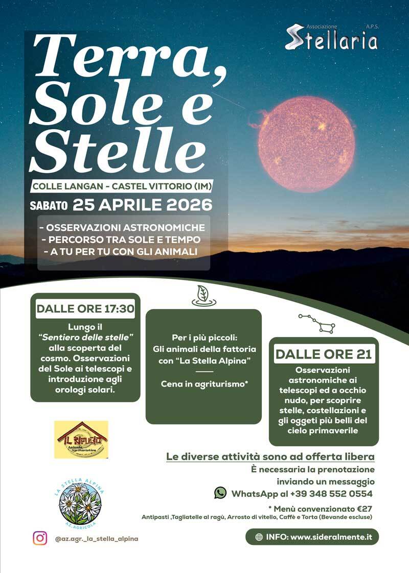 Appuntamento Sabato 25 Aprile 2026 nella suggestiva località di Langan, nel comune di Castelvittorio (IM), a oltre 1000 metri di altitudine, per l'inaugurazione della nuova stagione sul “Sentiero delle Stelle”. 500 metri di percorso che permettono però di viaggiare tra le profondità del cosmo e del tempo nello splendido scenario delle Alpi Liguri.