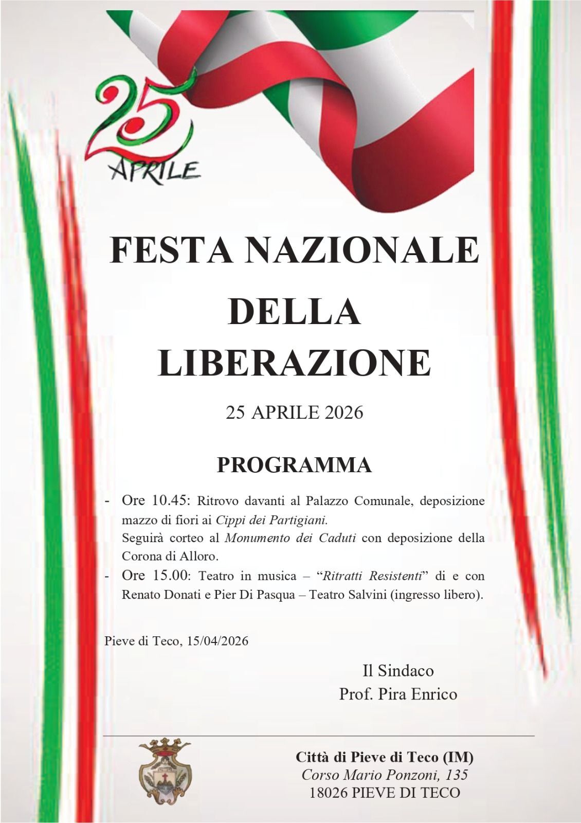 - Ore 10.45: Ritrovo davanti al Palazzo Comunale, deposizione mazzo di fiori ai Cippi dei Partigiani. Seguirà corteo al Monumento dei Caduti con deposizione della Corona di Alloro.