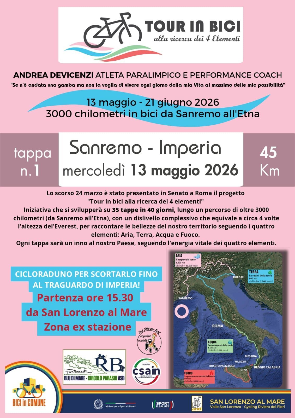 Mercoledì 13 maggio 2026 prenderà il via la prima tappa Sanremo – Imperia (45 km) del tour di Andrea Devicenzi, atleta paralimpico e performance coach, impegnato in un’impresa unica: oltre 3000 km in bici da Sanremo all’Etna!