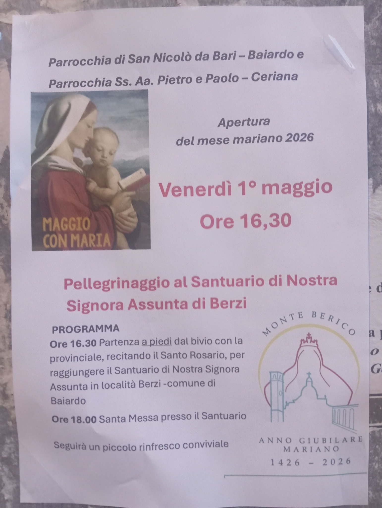 Ore 16.30 Partenza a piedi dal bivio con la provinciale, recitando il Santo Rosario, per raggiungere il Santuario di Nostra Signora Assunta in località Berzi - comune di Baiardo