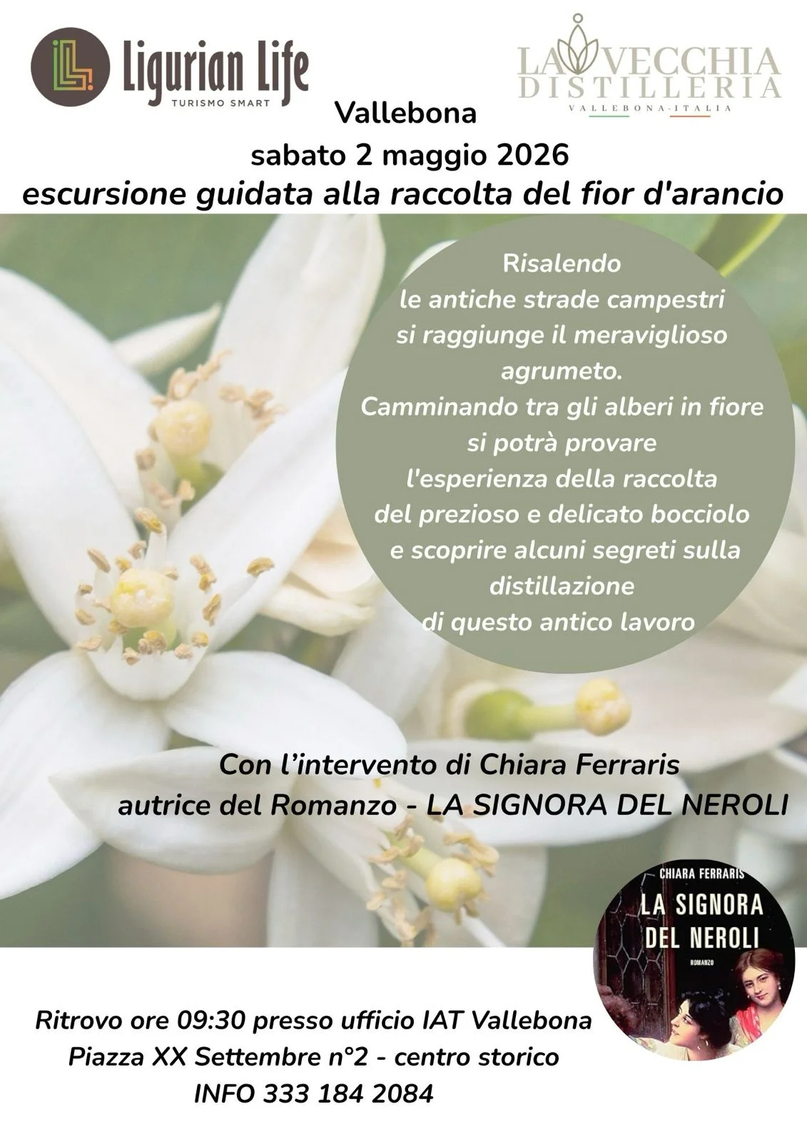 Sabato 2 maggio 2026 a Vallebona è in programma un’escursione guidata dedicata alla raccolta del fior d’arancio, un’esperienza che unisce natura, tradizione e cultura del territorio.